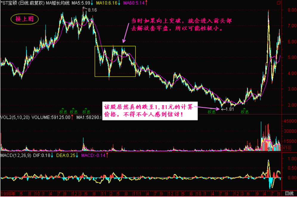 这里有必要注意一个问题,对于庄股,如果在高位反复盘整后被向下突破,那么下跌幅度往往会超过这个盘整带的厚度,这个盘整带其实就是庄家的出货平台,一旦向下突破,说明庄家已经基本清仓完毕。其后的下跌空间往往较大,否则庄家不足以再次介入。