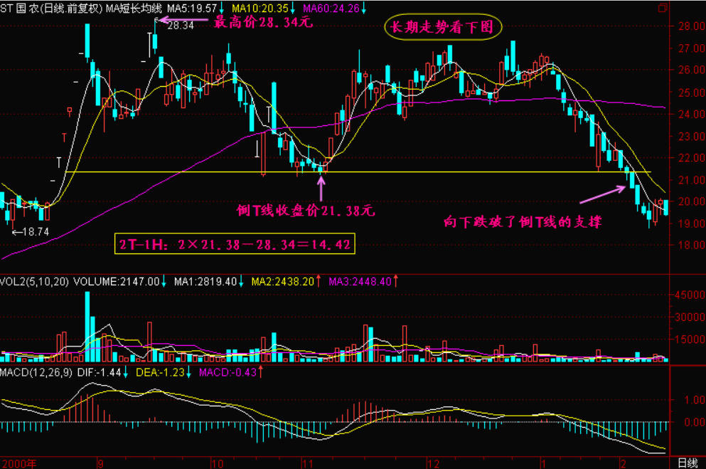 股价在高位反复盘整,一旦股价向下突破,至少的下跌幅度就是这个盘整带的厚度,用公式计算就是【2T-1H】。