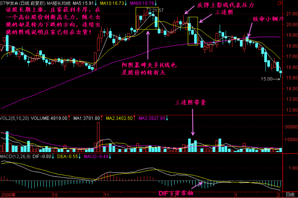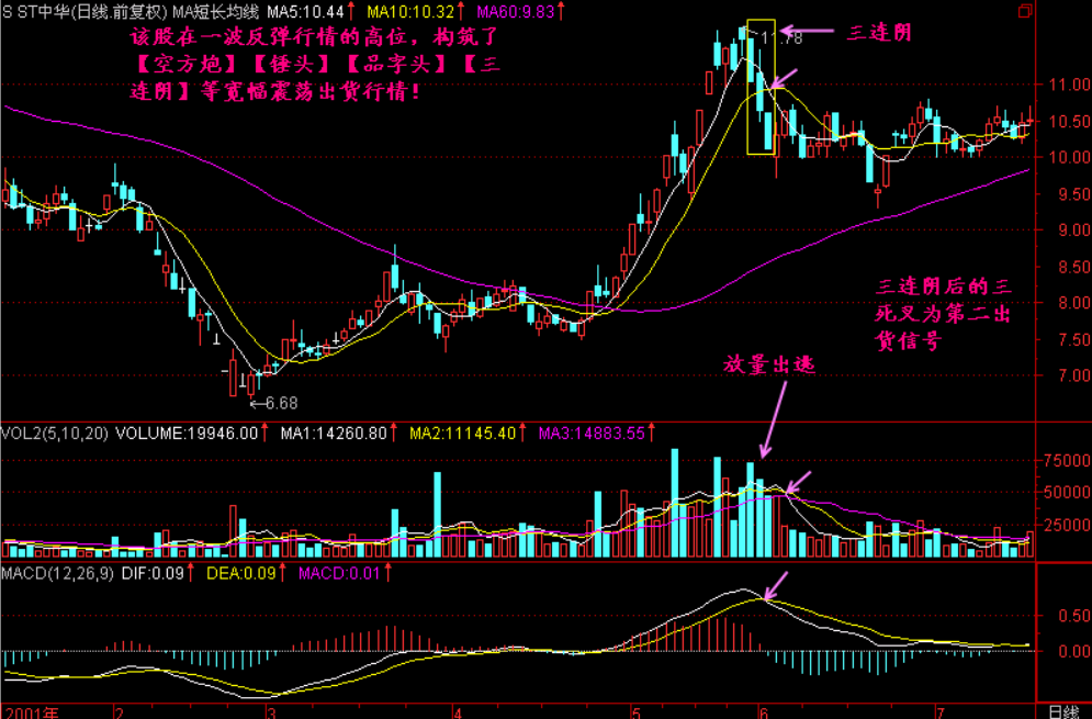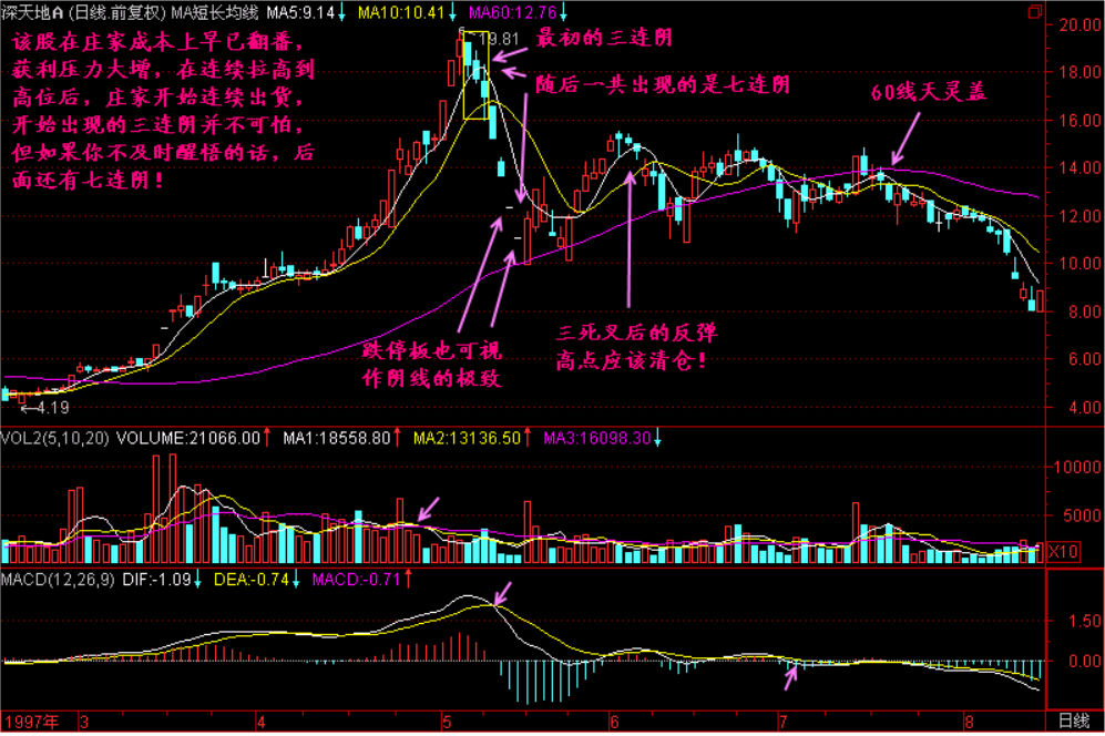 顺便提醒一下,在三连阴以后,一般都有三死叉见顶的信号,那可是最后撤退的机会。