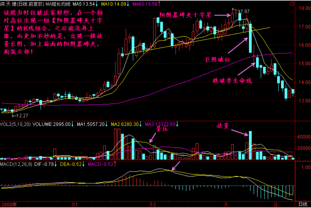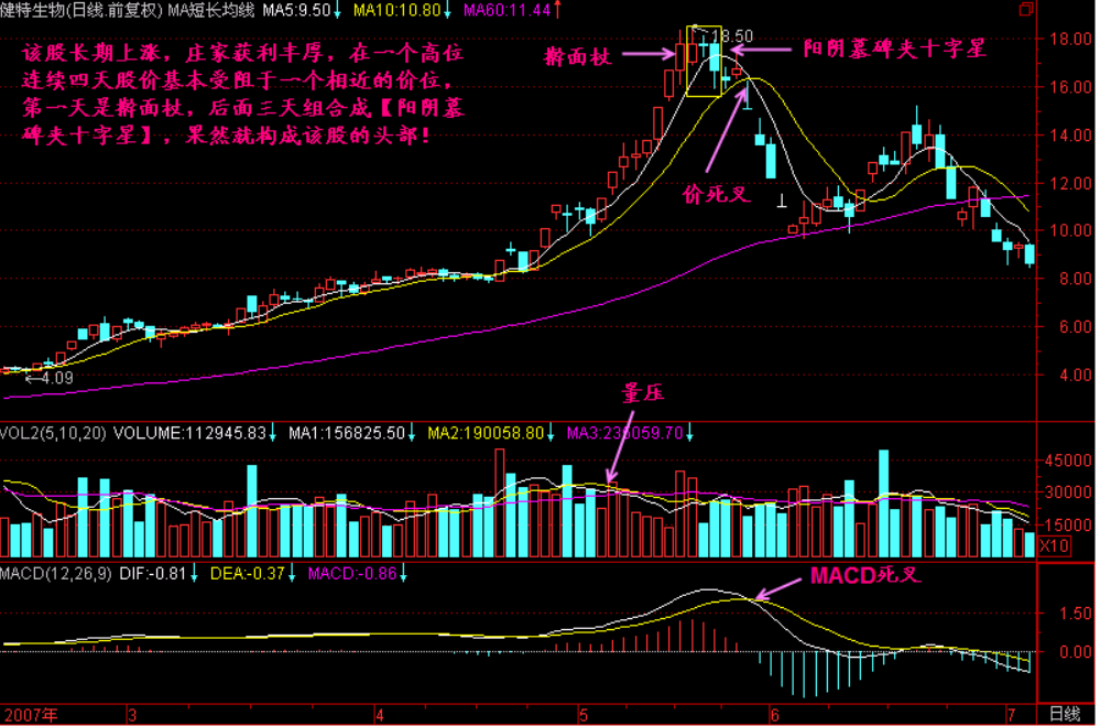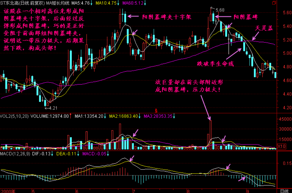 如果我们把【阳阴墓碑夹】中间的K线拿掉,那就是阳阴墓碑,阳阴墓碑就是头部信号了,如再加上“锤、星、针、杖”,则更加是头部了!