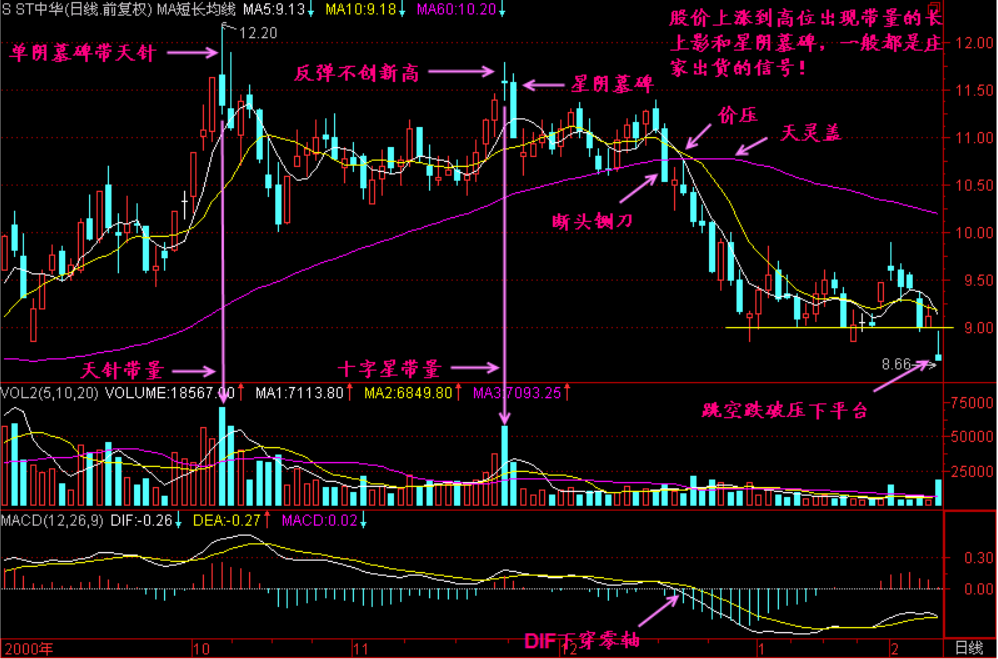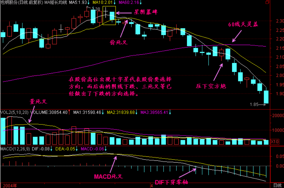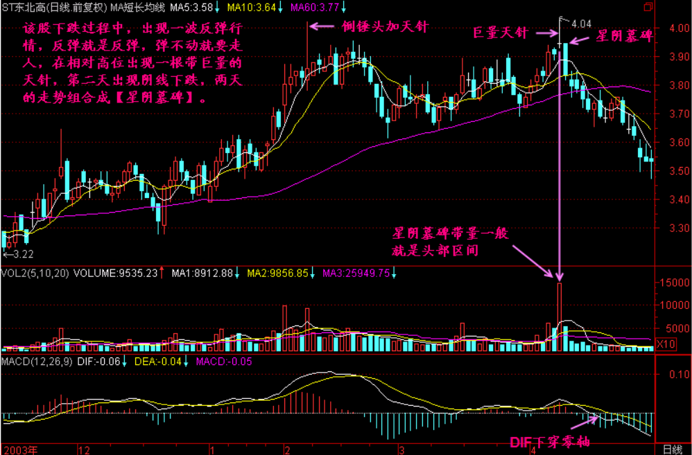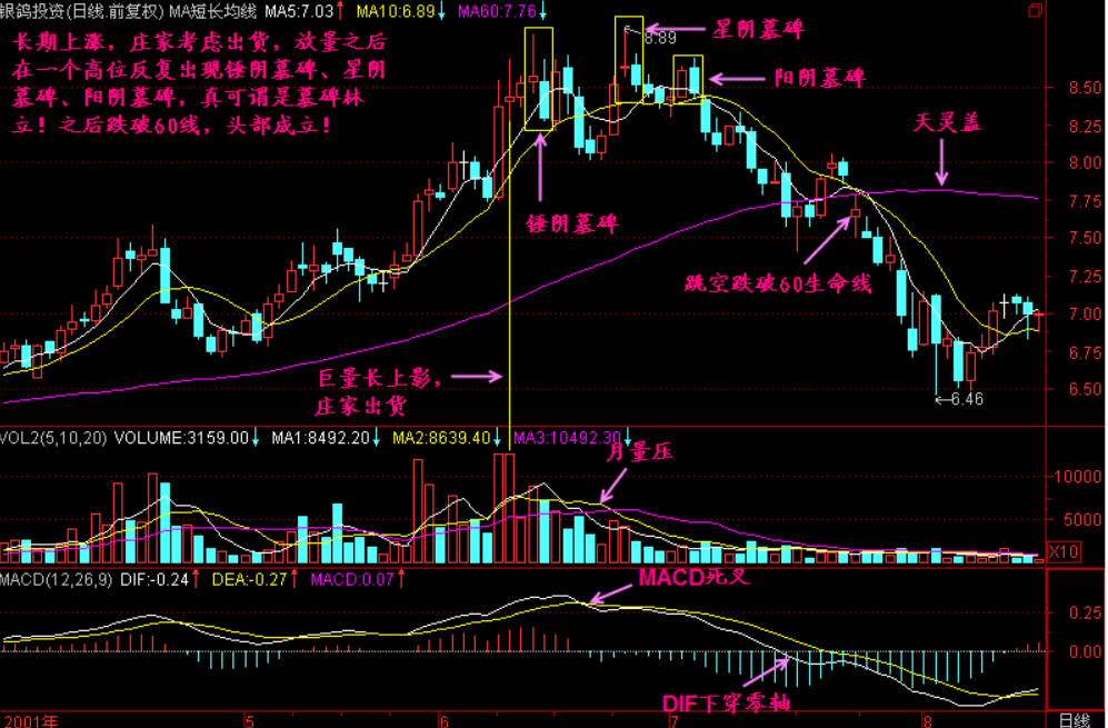 一旦高位形成【星阴墓碑】之后再出现【三死叉见顶】,则增加了判断为头部的可靠性,如果股价有效跌破60生命线,则头部正式成立!