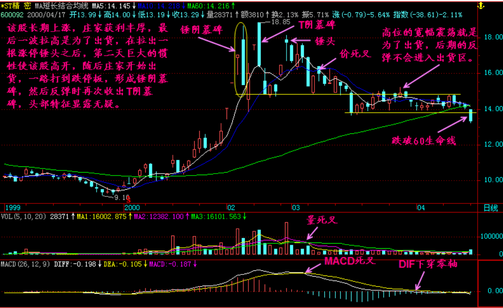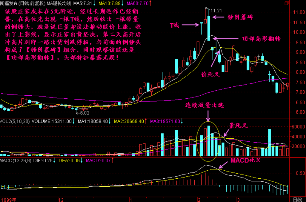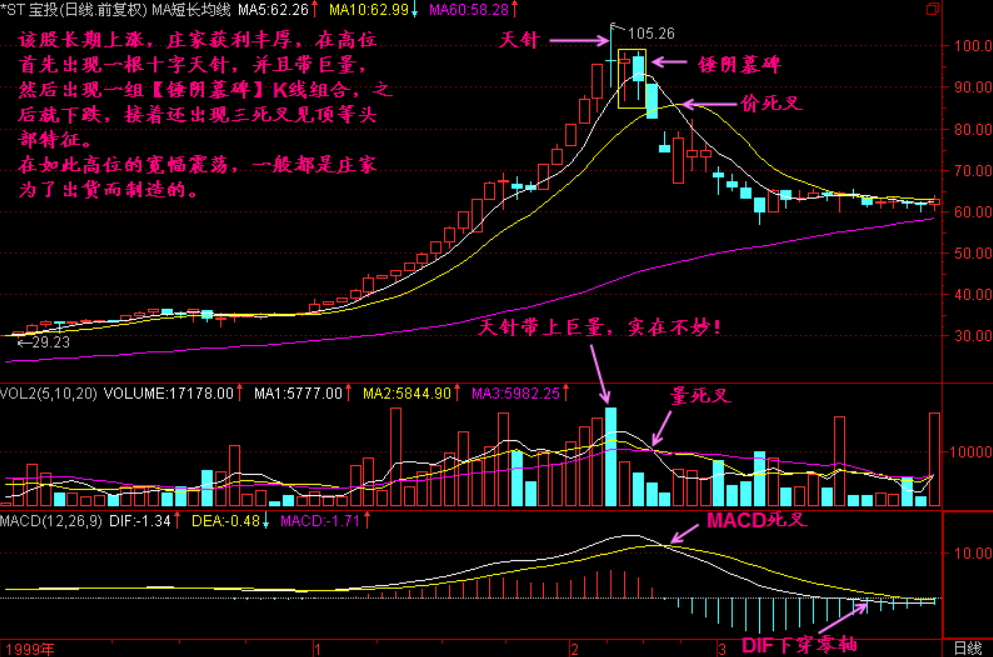 小结:在股价高位出现【单锤】就可怀疑是头部,如果再出现阴线跌破单锤,就更要引起警惕,特别对于带量的锤或阴线组成的【锤阴墓碑】,形成头部的概率大增!