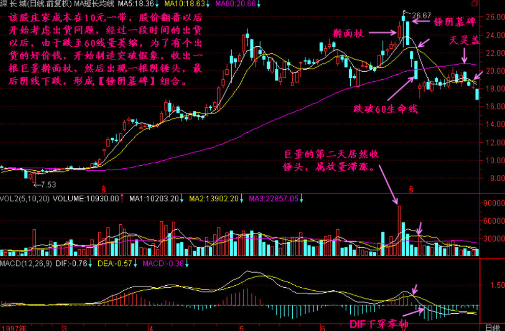 这就是【锤阴墓碑】,可以想象用锤去敲打墓碑,惊动了鬼魂,惹来了麻烦。在上升行情中一旦出现这种【锤阴墓碑】,那么行情就有麻烦了。