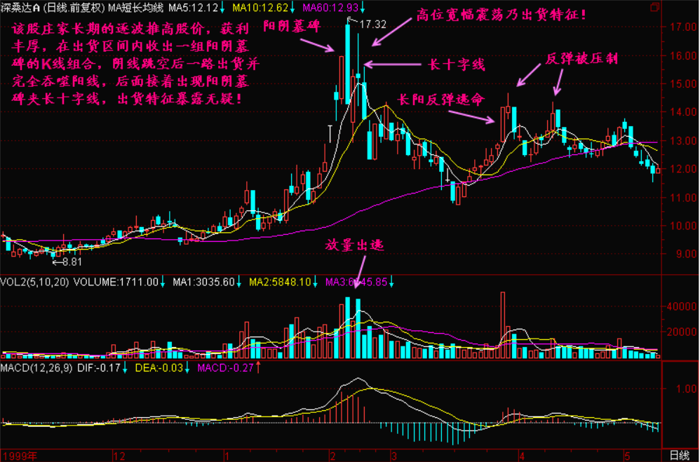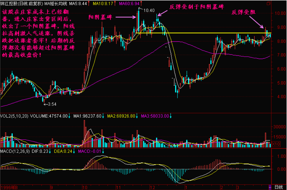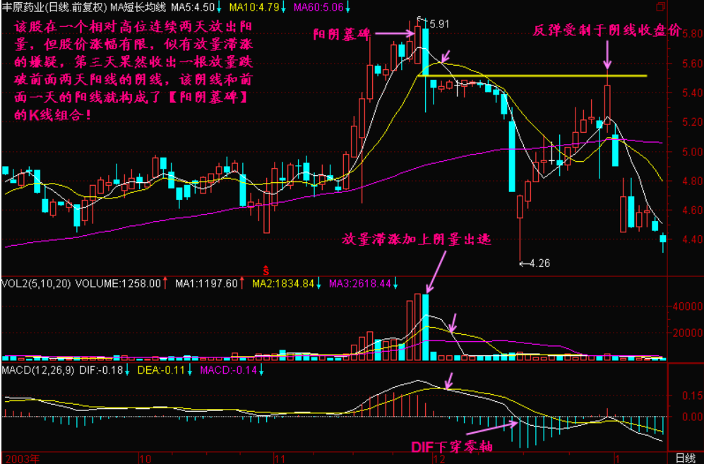 小结:阳阴墓碑是使用阳线诱多,然后阴线杀跌套人的方式,如果出现在庄家获利丰厚的高位,则构成头部的可能性增大,一旦跌破60生命线,则头部成立。