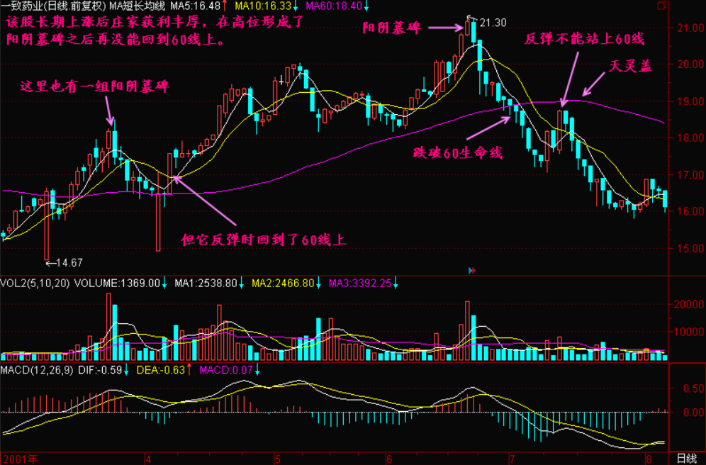当股价在高位收出阳阴墓碑之后,一旦跌破60日生命线,即宣告头部成立!