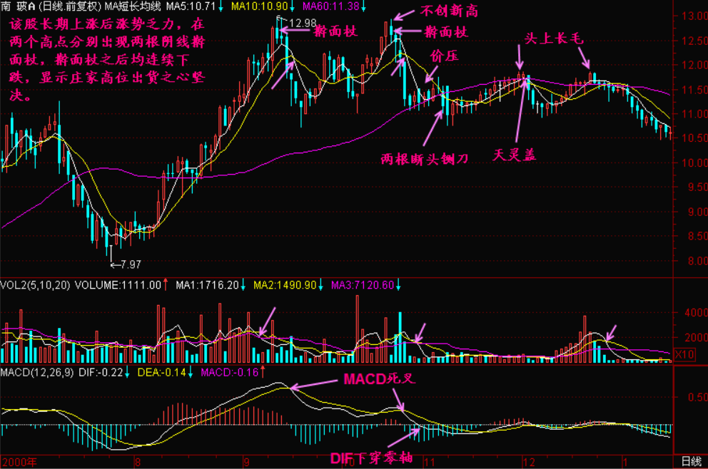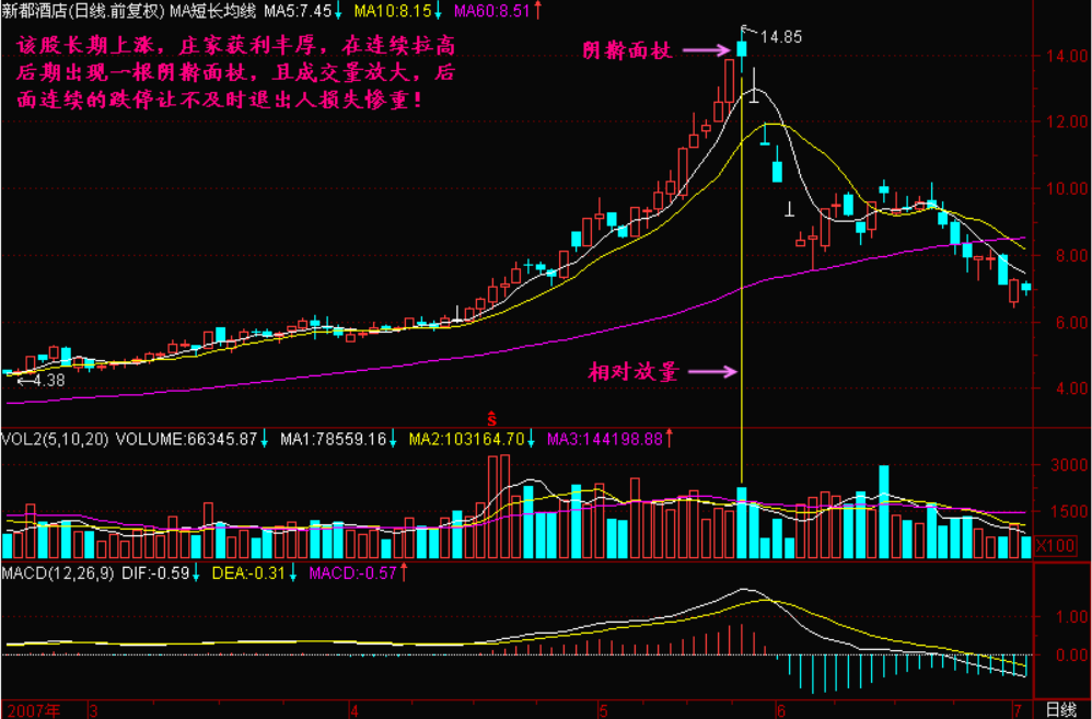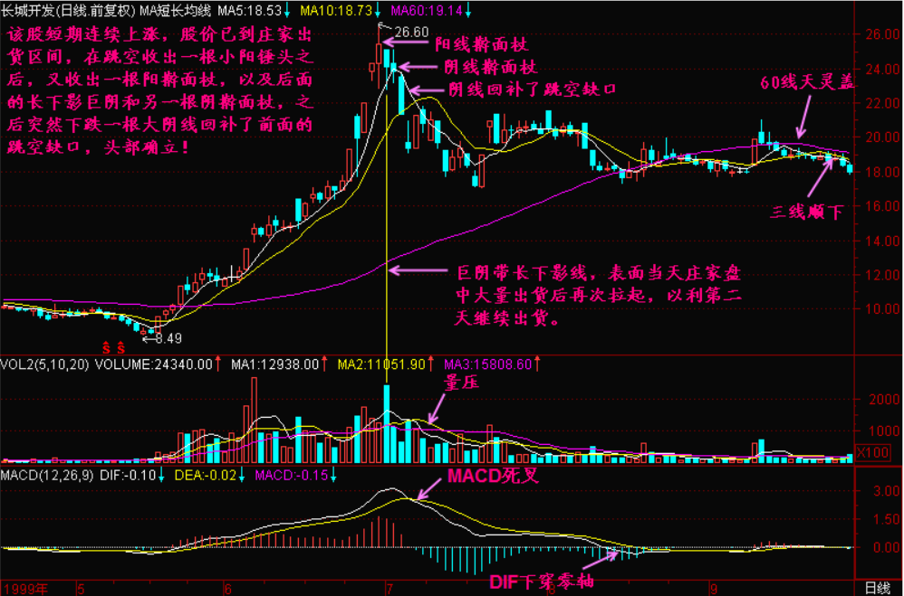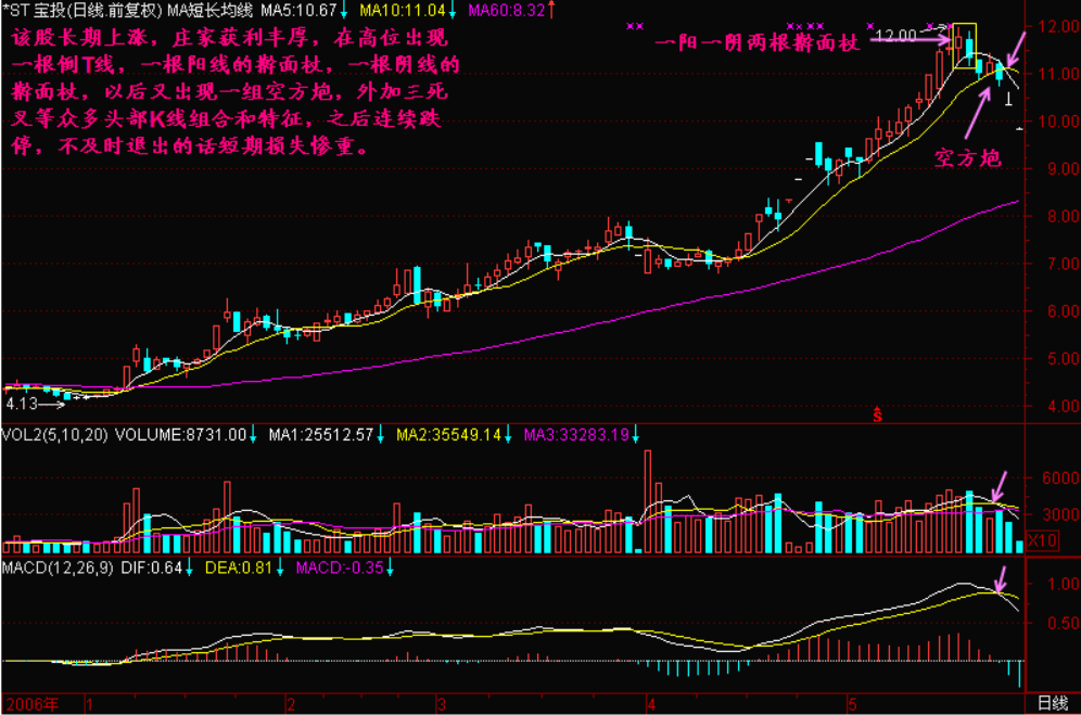 小结:理论上来说,阴线擀面杖当天就有资金退出,阳线擀面杖还留给大家一个繁荣的假象,但无论是什么类型的擀面杖,只要股价不能再创新高,且又是处于股价的高位时,则形成头部的可能性增大了,一旦连续出现其它头部K线组合并跌破60线生命线,则头部成立!
