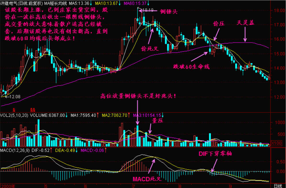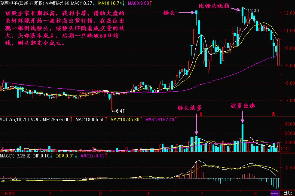 小结:高位出现【锤头】往往是庄家盘中出货后拉起所形成,如果后期股价反弹不能再创新高,则该锤头已成为名副其实的【天锤】!
