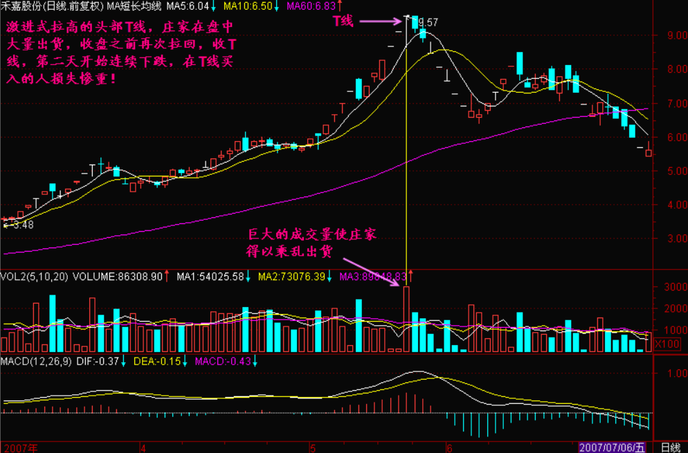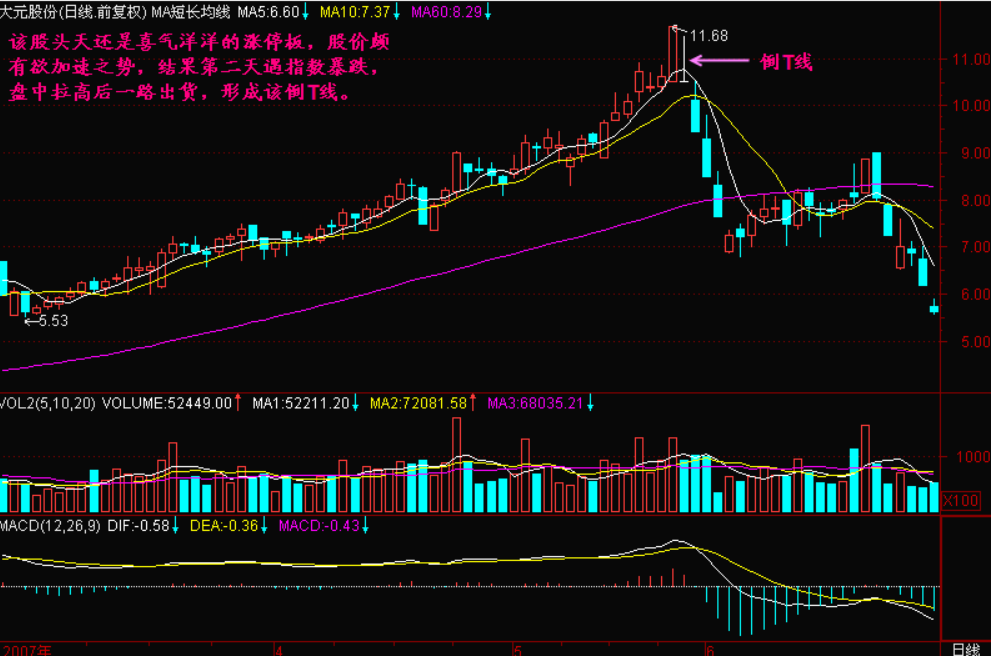 小结:无论是【T线】还是【倒T线】,只要出现在股价的相对高位,就应该怀疑是不是头部到了,特别对于巨量T线更应该注意。只要后期不能再创新高,反转下跌,那么就基本可判定为头部区间,如果再跌破60日均线,则不必再有怀疑了!