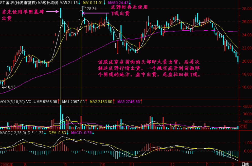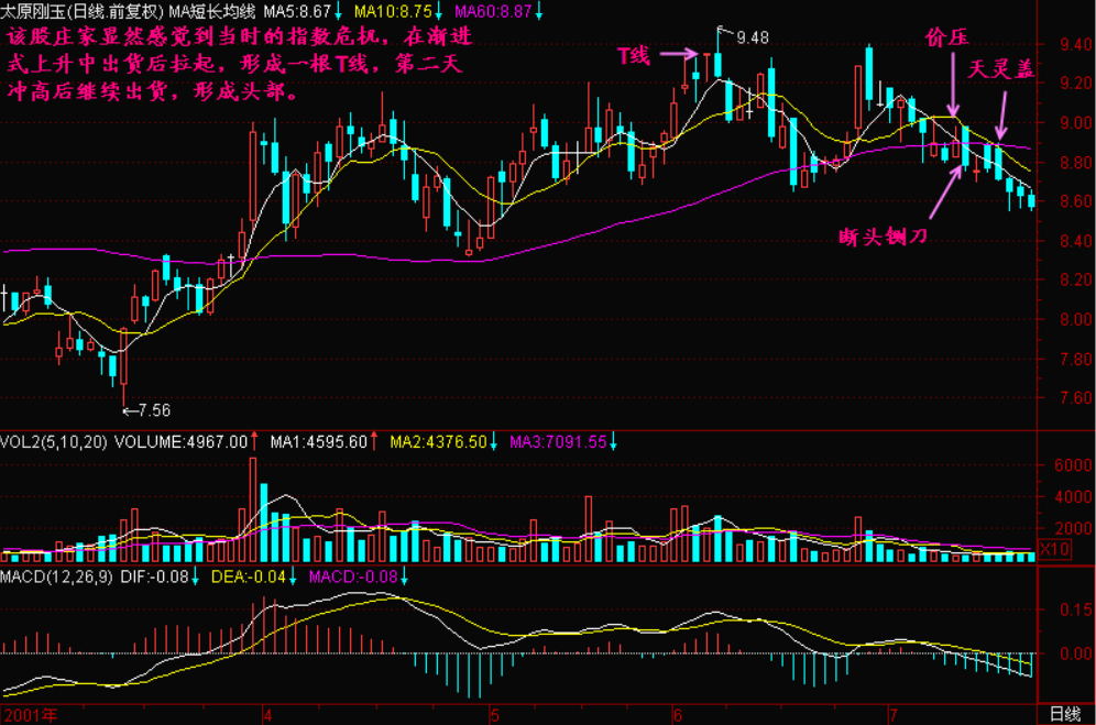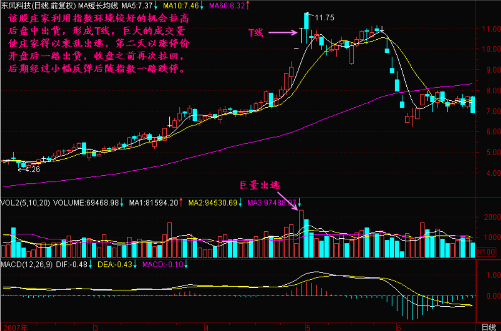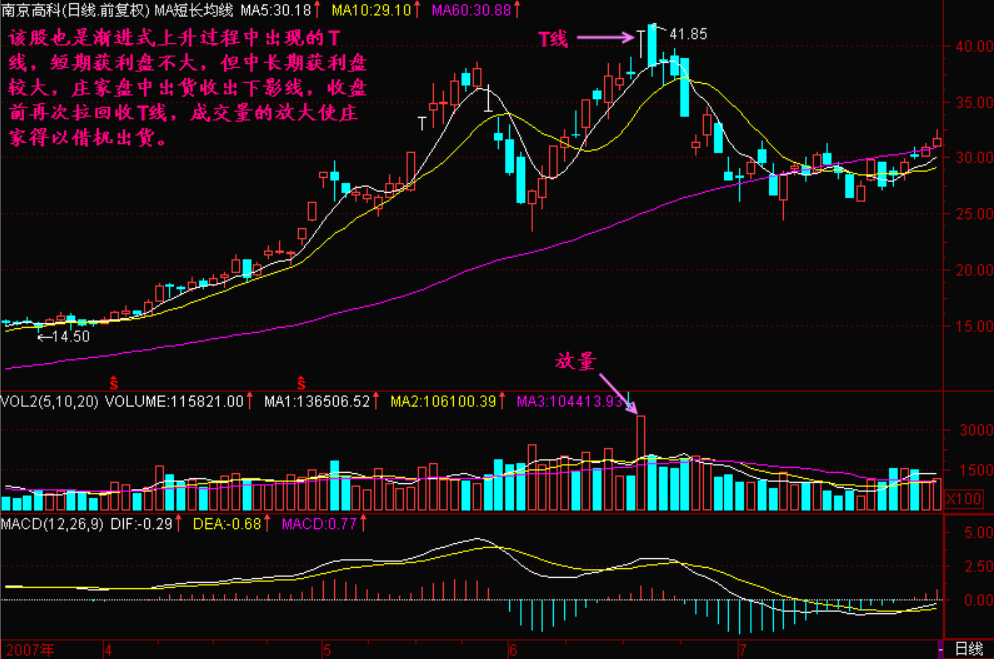 一般情况下,这一类T线头部的下跌速度也是渐进的,直到跌破60日平均线后,才可能出现加速度下跌。