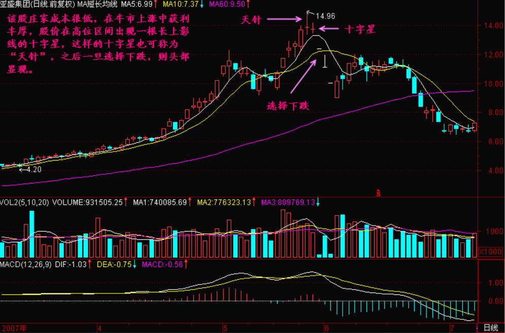 下图的个股由于十字星的上影线过长,再称为十字星就不妥了,那就称为“天针”。