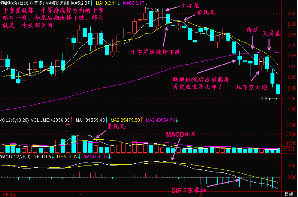 十字星确实有涨也难,跌也难的意思,但它只表明在这一天的行情中,多空力量平衡,今天股价走势失去方向,这正好说明未来将寻找突破的方向。如果未来股价选择向上突破,那么这一天的十字星处于股价的低位,或称底部。如果未来股价选择向下突破,那么这一天的十字星处于股价的高位,或称头部。