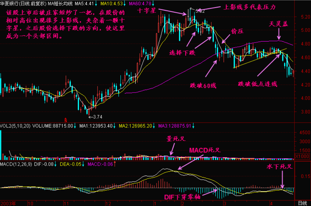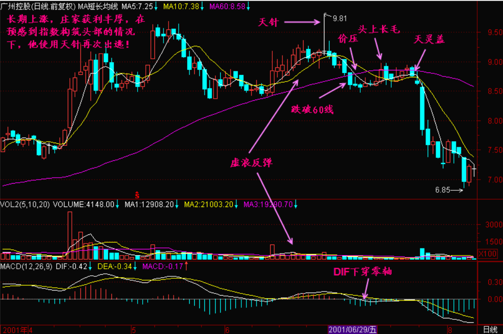 表面上看,一天下来收盘价等于开盘价,表明整天的多空力量是平衡的。实际上市场内部的结构在发生变化,庄家坚决做空,使股价拉出下影线,散户坚决做多,使股价拉出上影线,最终庄家的力量和散户的力量取得暂时平衡。原来高度集中的庄家筹码正在向高度分散的散户发散,当这种股价筹码由集中向分散进行到一定程度的时候,市场由强势转为弱势。量变引起质变,股价开始构筑头部。