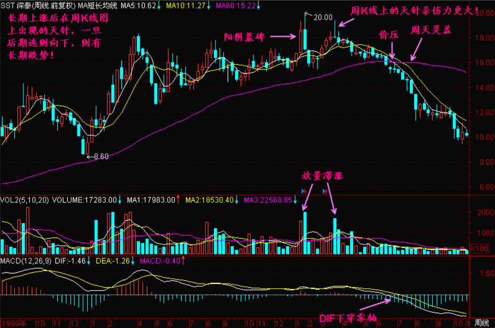 股价高位出现的周十字星、周十字架和周天地针是稳定的头部信号。