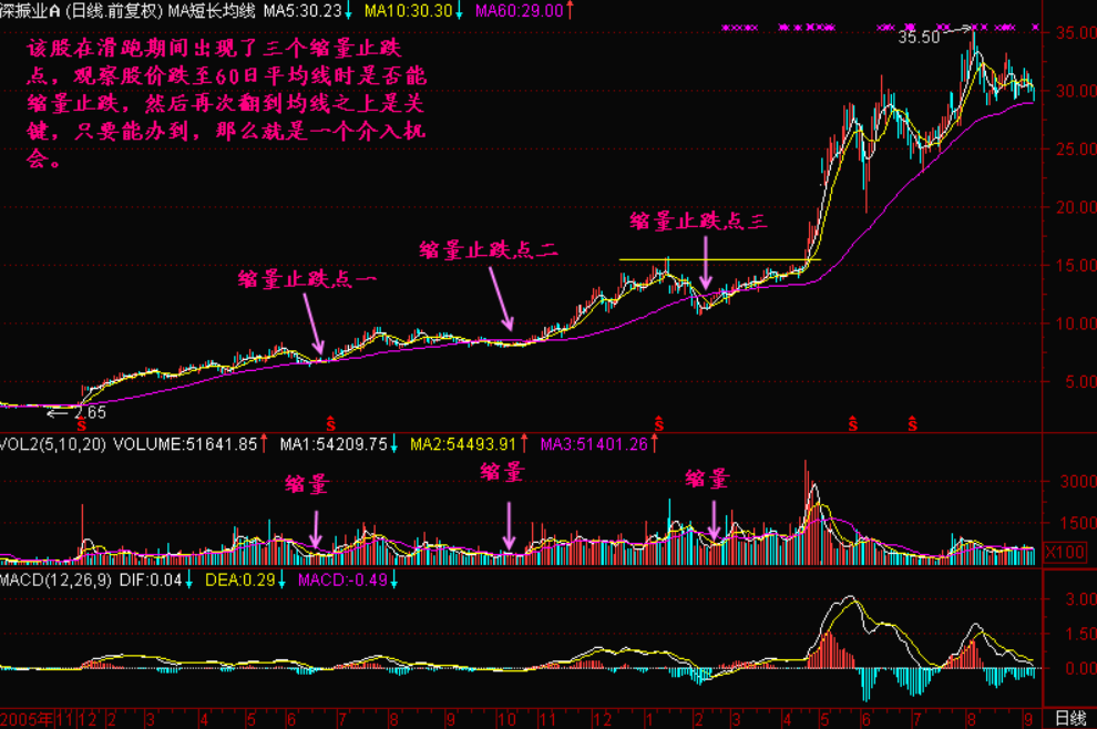 我们把5日、10日均线靠近60日均线称为【缩量止跌点】,在一个大牛股的滑跑过程中,有时会出现第一【缩量止跌点】,第二【缩量止跌点】,甚至第三第四【缩量止跌点】,这都是买入的机会。