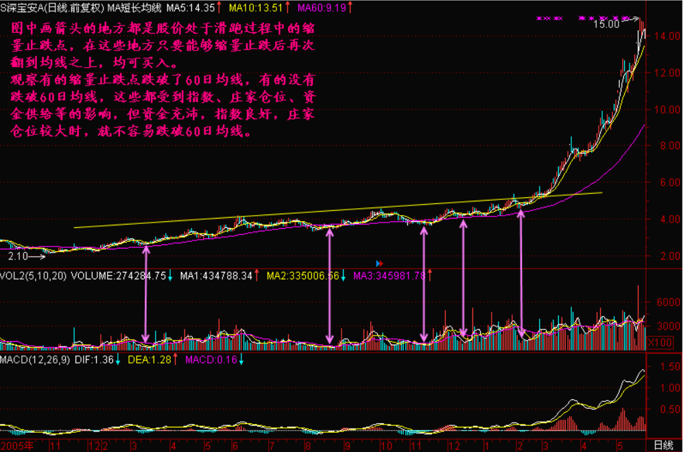 所以,当股价跌到60日平均线附近时,可以观察其成交量是否极其萎缩,股价能否在这里翘头向上,并发生金叉,如果是的话,这里是较好的买入点。