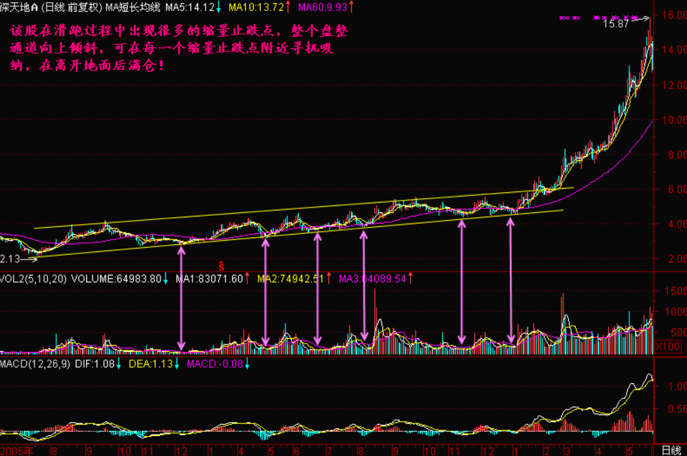 当一只个股进入起飞线后即开始滑跑,在整个滑跑过程中会出现多次震仓洗盘,而震仓洗盘的低点一般都在60日平均线附近。