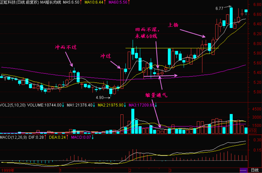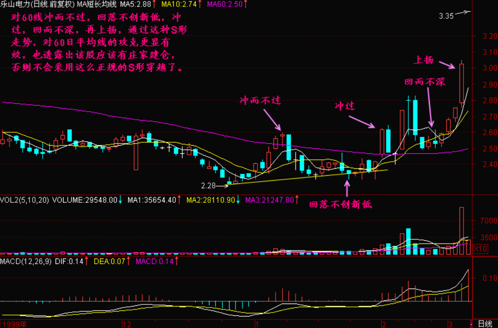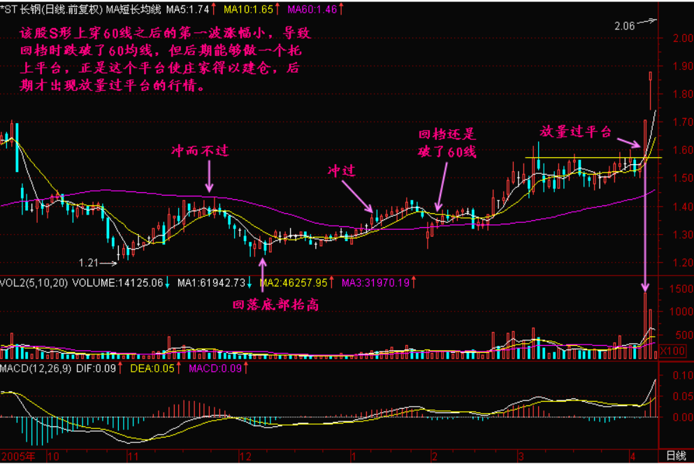 小结:标准的【S形】穿越60均价线透露出一种信号,那就是人为操作的信号,否则不足以走出这样标准的走势。这是对60日均价线的攻克,同时也是庄家不断驱赶散户和自我建仓的手段。