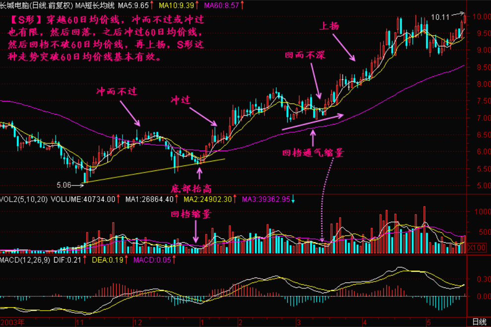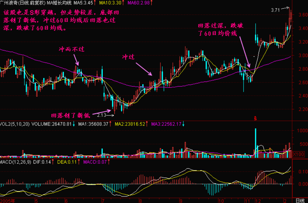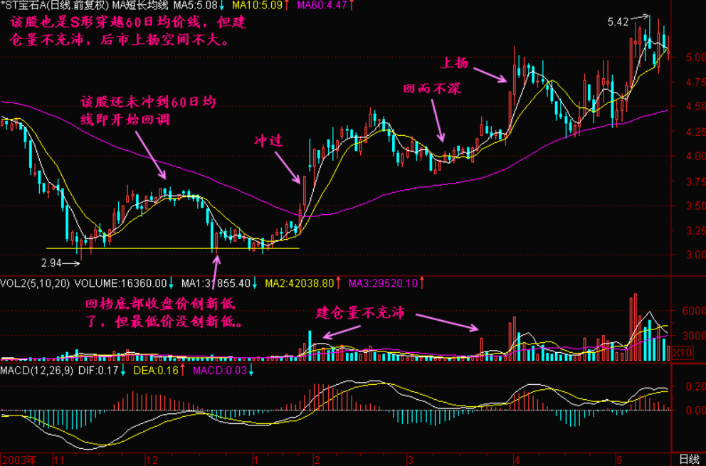 以上的股价走势对60日均价线的穿越酷似S形,我们就称之为【S形】穿越。