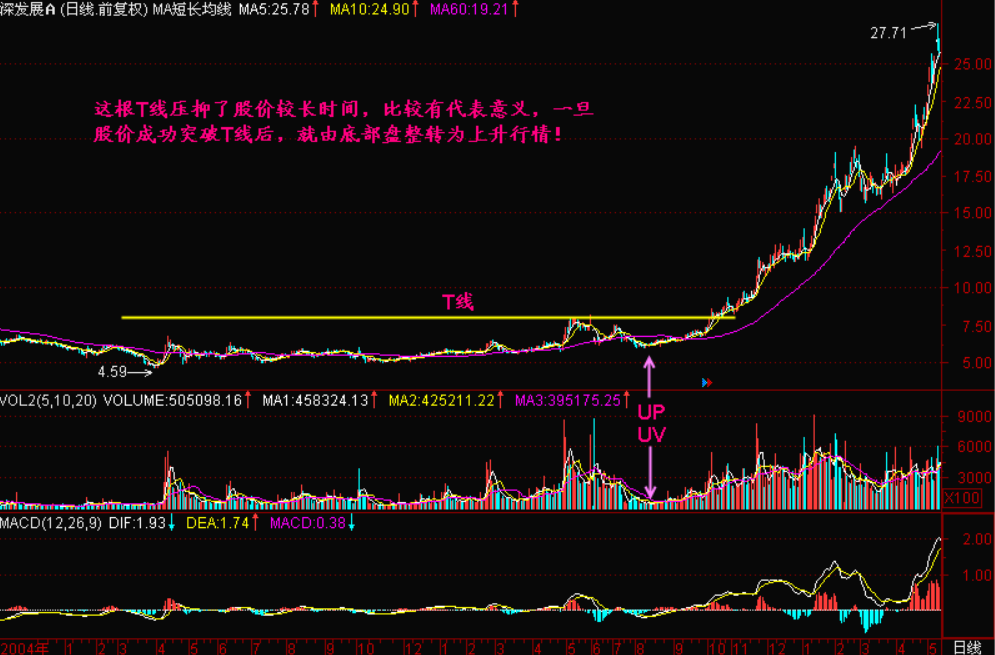 既然突破T线后要开始涨势,那么在突破这根T线之前必须判断庄家已经建仓完毕,只有建仓完毕且控盘的庄股,在突破T线后才会飞黄腾达。这样的突破才有意义。而要判断庄股是否控盘的标志,就是【UP】和【UV】,只有找到了UP、UV,才能找到建仓完毕的庄股!