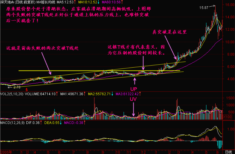 对T线的突破我们最好观察一下,如果之前出现过明显的【UP】和【UV】技术特征的,那么在突破瞬间可以马上追进,因为已经辨明了庄家控盘了!而之前没有这些特征的,就最好等待出现反压且不破T线的情况下,再追进。