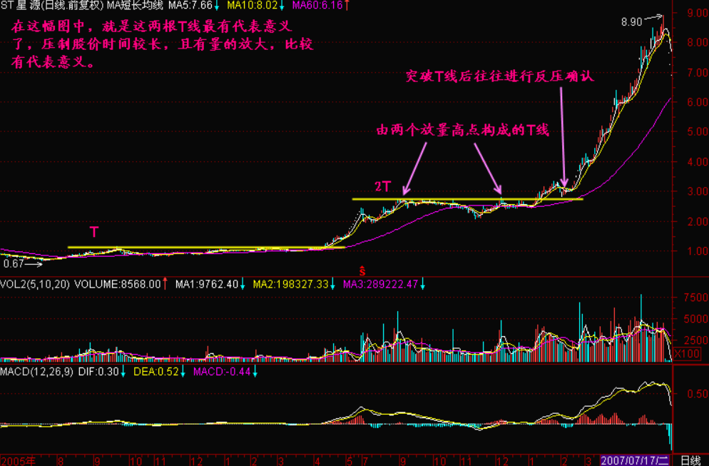 需要强调的是,T线会在股价上升中自动上移。但并不是每根T线都有代表意义,应该选取那些有量支持的、由较多根K线顶部所形成的T线。