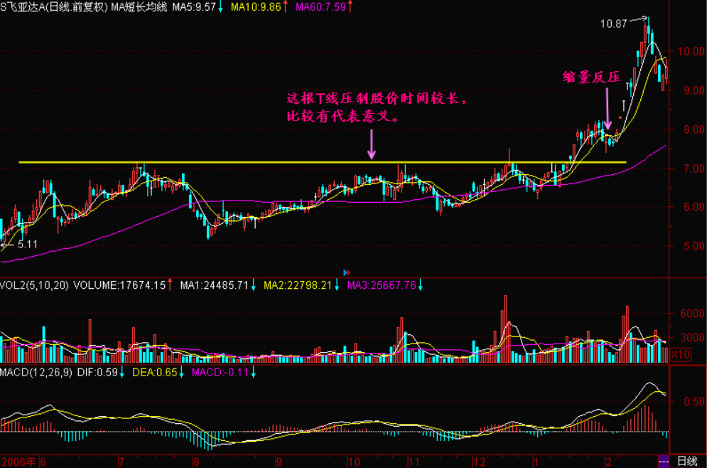 一定要选取有代表意义的T线,该T线要能压制住一段时间的股价,股价久攻不过,且每次碰到T线时都带量,就是说要选取有量支持的,能在一段时间内压制较多收盘价的T线,这样的T线才有代表意义;