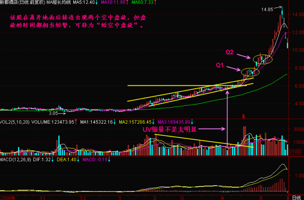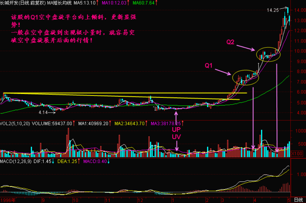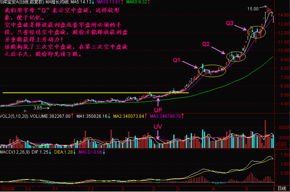 小结:空中盘旋是主力为了释放获利盘和套牢盘而设计的,可按时间长短划分,按盘旋次数命名,第一个空中盘旋就称为“Q1”,第二个空中盘旋就称为“Q2”,依此类推,但很少有出现四个空中盘旋的,但并不是说没有,特别在一轮大牛市下,只要环境许可,主力可以进行很多次的空中盘旋。