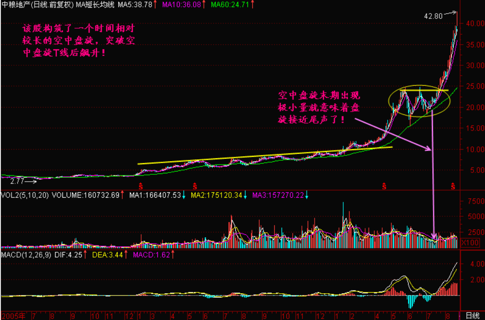 无论什么样的空中盘旋,在盘旋到成交量出现极小量之后,意味着盘旋接近尾声了,只要股价再次放量突破空中盘旋最高收盘价T线,则行情继续向上发展!