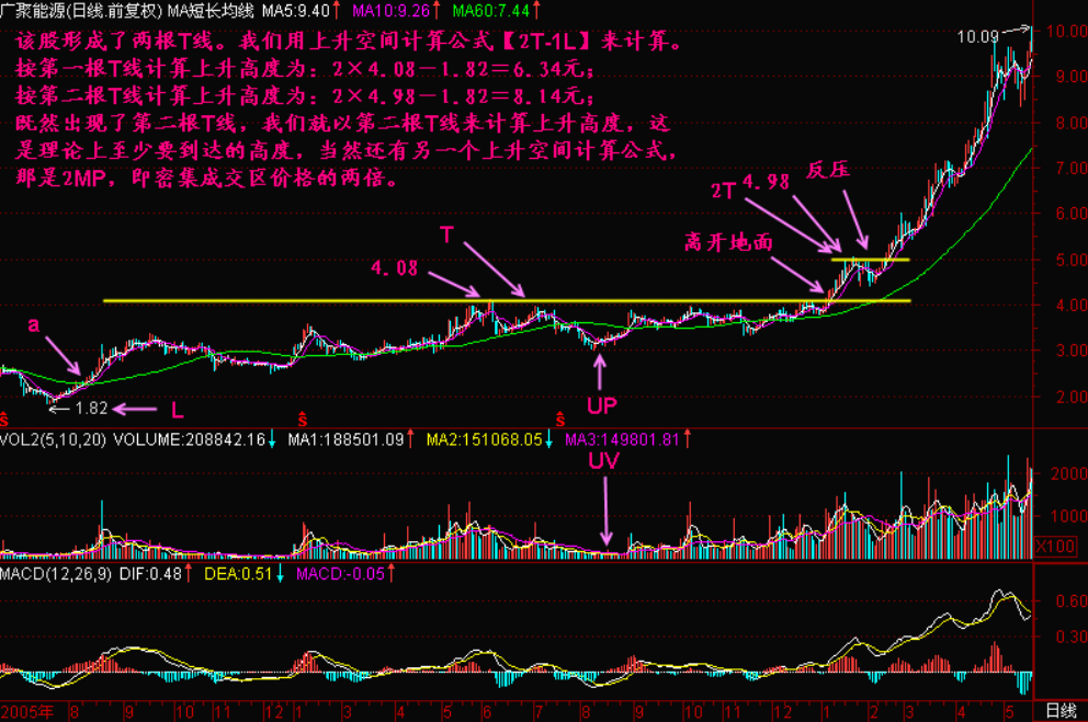 T线并不是唯一的,在离开地面之后还会出现反压前T线的情况,这时就形成了2T线,但不管有几根T线,我们都可以运用【2T-1L】公式计算出股价至少的上涨空间,以加强我们买入和持股的决心!