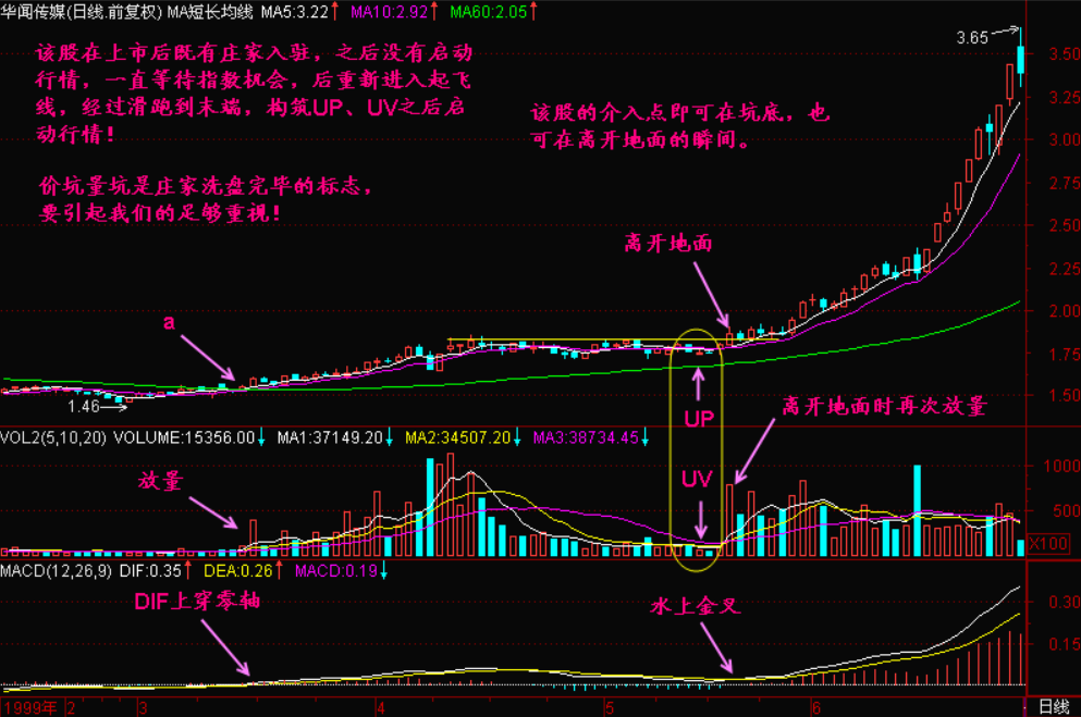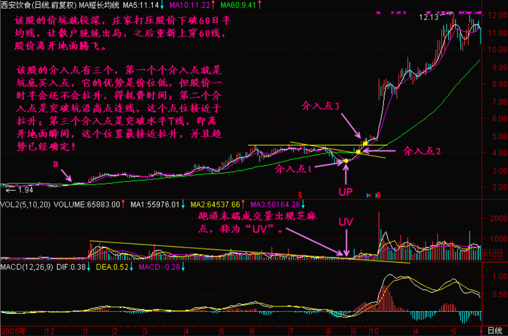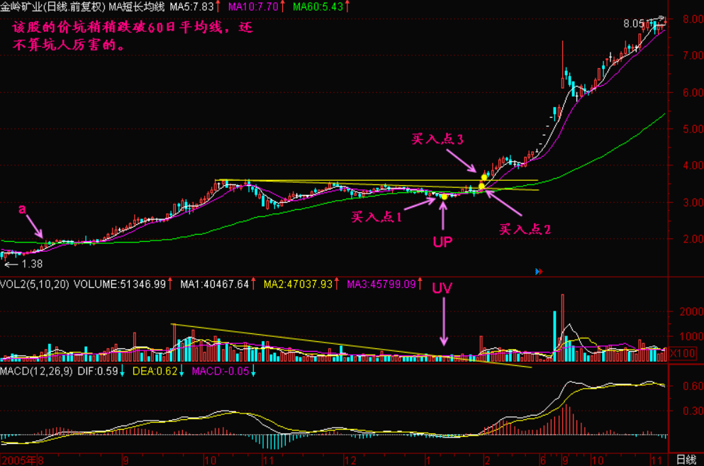 上图的价坑很浅,还不算坑人的。然而大部分庄家不会如此善良,他们会在股价拉升以前来一次大力度的【震仓洗盘】,于是留下一个很深的【UP】,这时候【价坑】的【坑】字,就是坑人的【坑】。