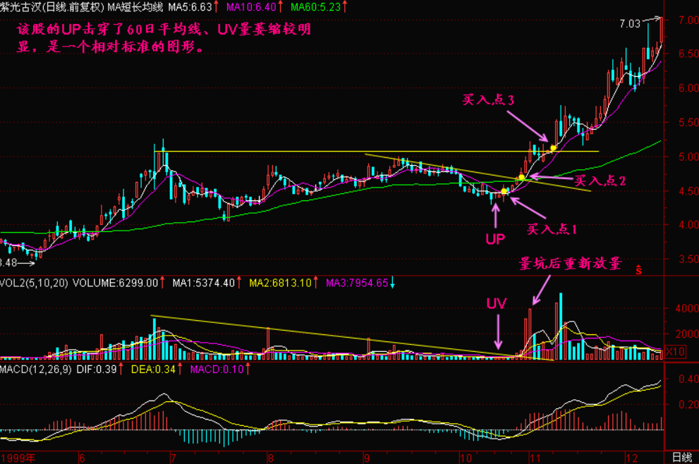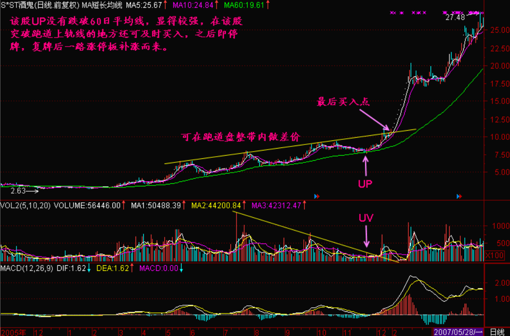 跑道坑【UP】与量坑【UV】是股价进入飞行线滑跑到末端时的重要特征,之后就离开地面,加速上升了。