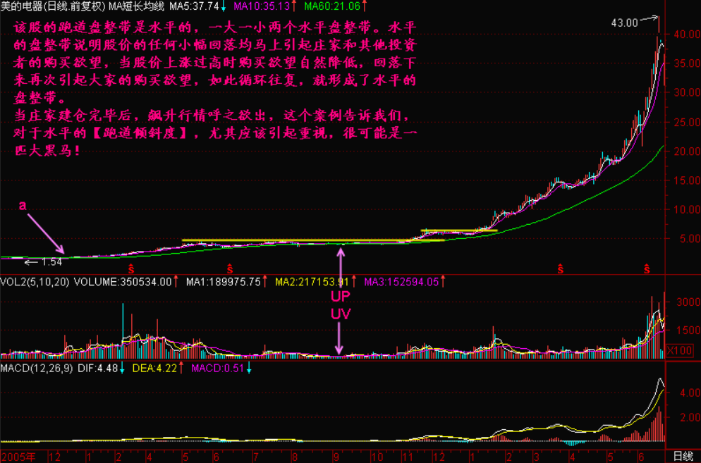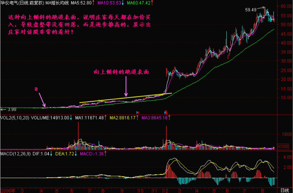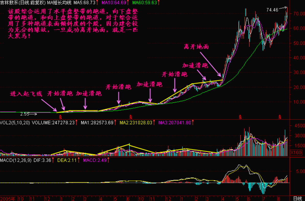 有的个股跑道时间稍长,综合运用了各种倾斜度的跑道,这样的股票由于庄家建仓较充分,往往是大黑马的前兆!
