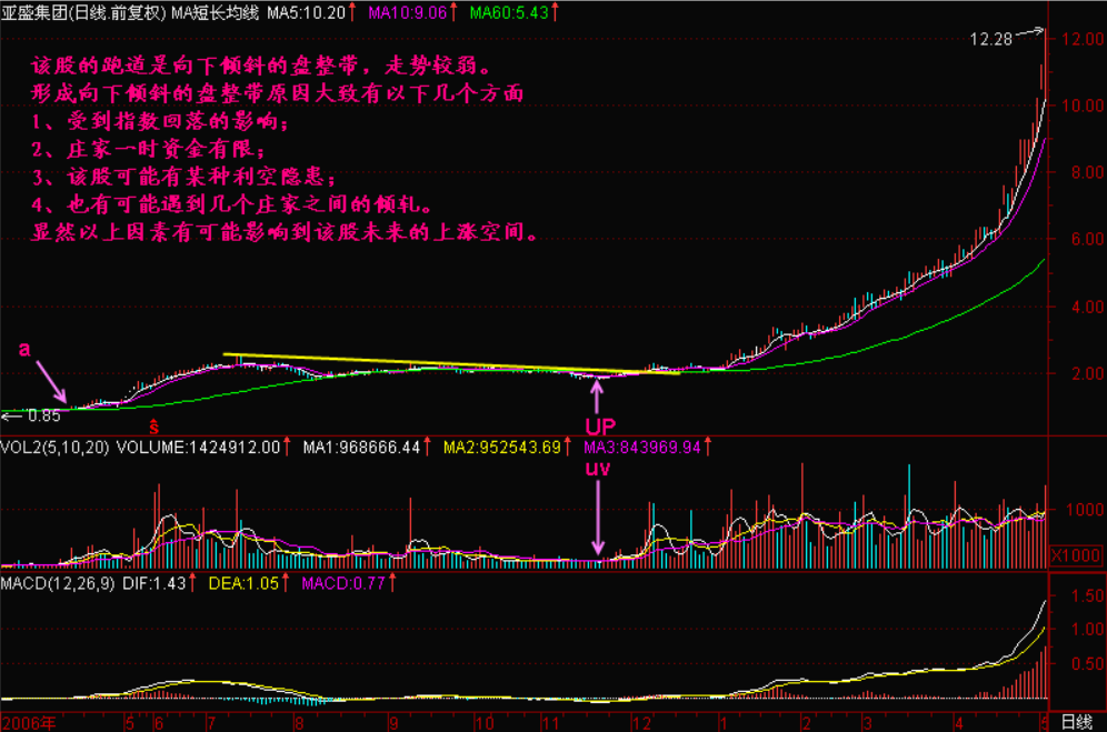 A .股价左高右低,形成向下倾斜的盘整带,【跑道表面】是向下倾斜的这种走势较弱;