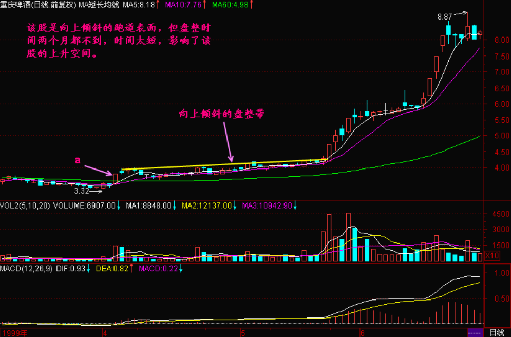 C .股价左低右高,形成向上倾斜的盘整带,【跑道表面】是向上倾斜的,这种走势较强。