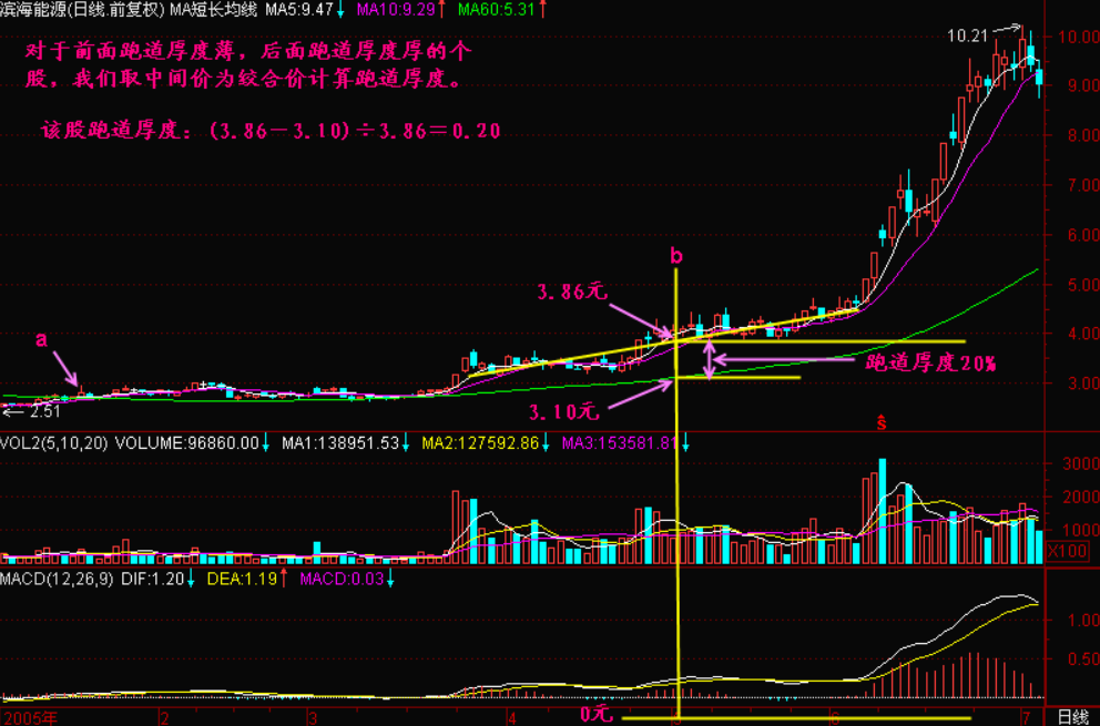 在(图70-1)中,我们在b垂直线处得到5日、10日绞合处的均价为9.95元,60日均线为8.04元,那么【跑道厚度】等于(9.95-8.04)除以9.95元等于19%。这是一个相对数,在一般情况下,这个数值越大,说明主力买进该股时的追涨决心越大,也意味着未来该股的上升空间越大。