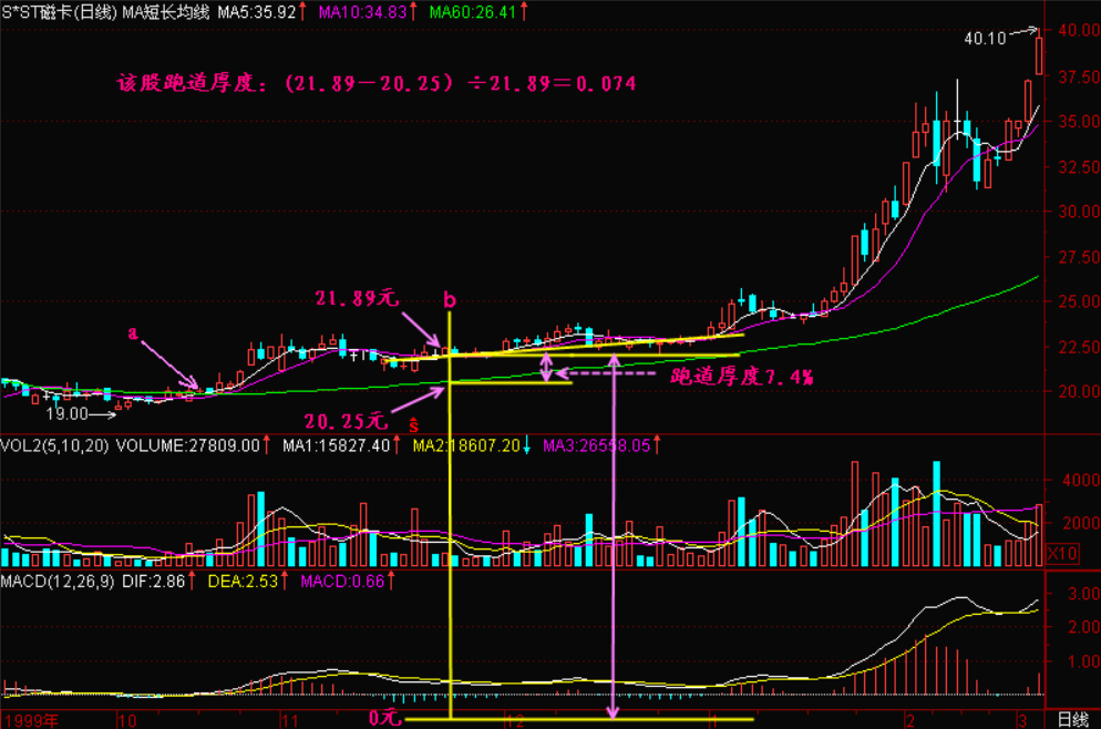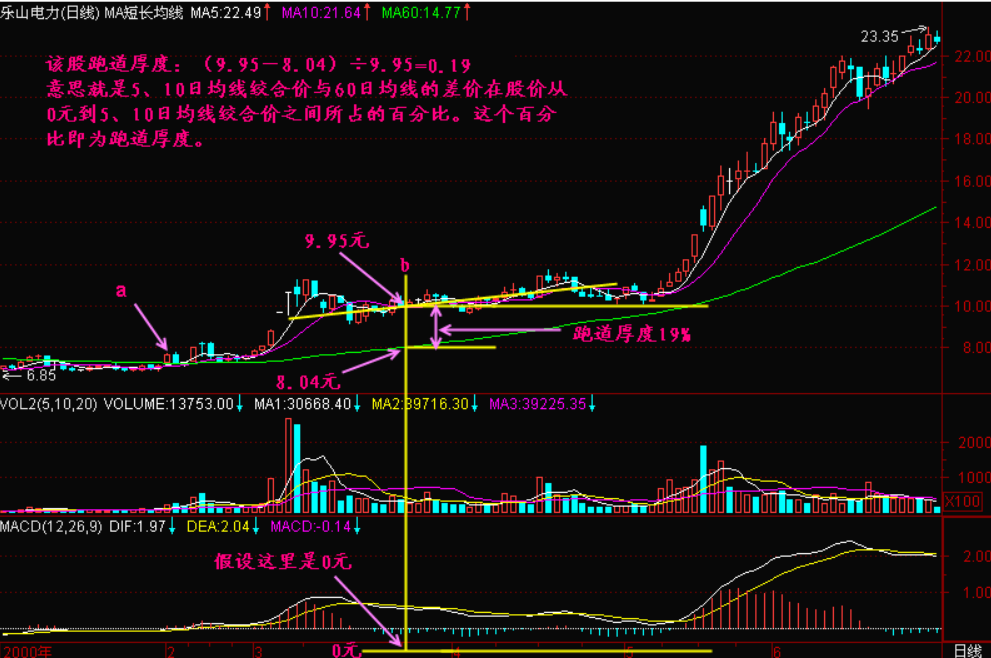 该股99年9月10日放量冲过60日平均价19.17元,而后继续上扬,直到99年11月1日股价冲高到23.20元才稍有回落。我们要等待其回落后,找出它的5日均线和10日均线绞合的均价(因为只有当股价冲高后回落,并进入横向震荡阶段,此时才能找出横向震荡中的平均价。而最能代表这个平均价的就是5日、10日均价的绞合处)。我们在b垂直线处得到5日、10日绞合处的均价为21.89元,60日均线为20.25元,那么【跑道厚度】等于(21.89元-20.25元)除以21.89元等于7.4%。乐山电力的【跑道厚度】比天津磁卡的【跑道厚度】厚。从一般的意义上来说,【跑道厚度】越厚的个股未来上升空间越大。