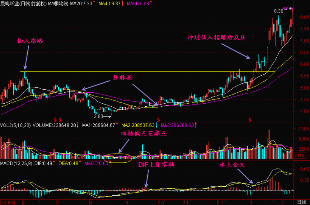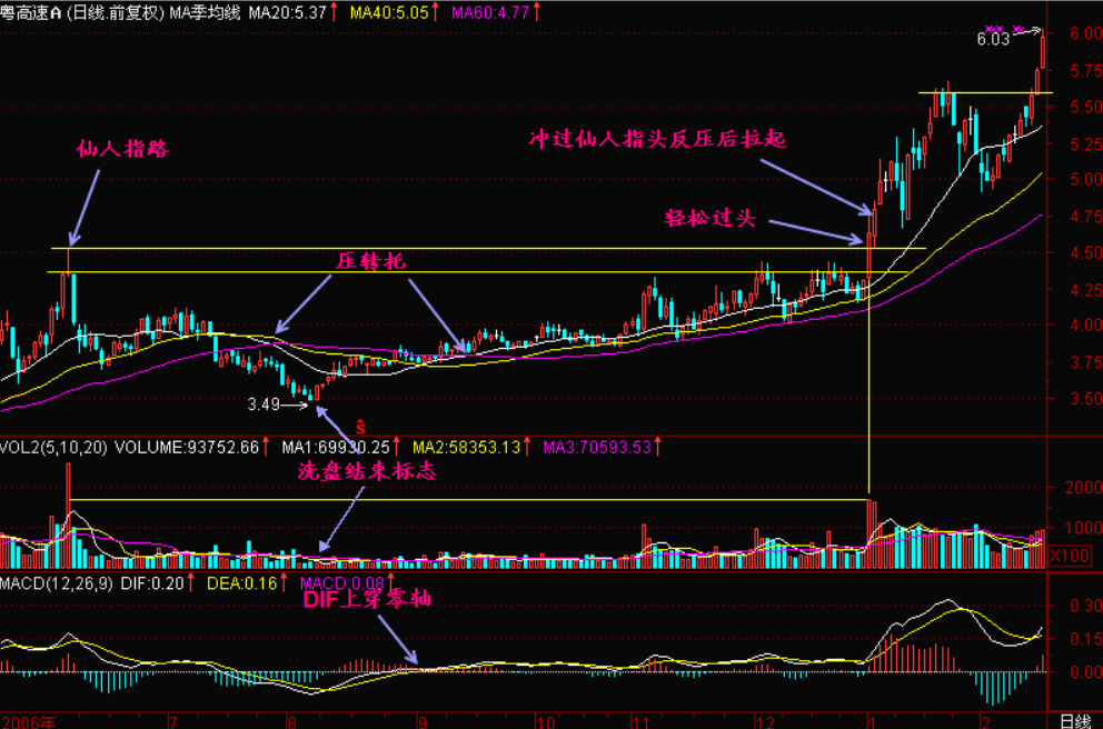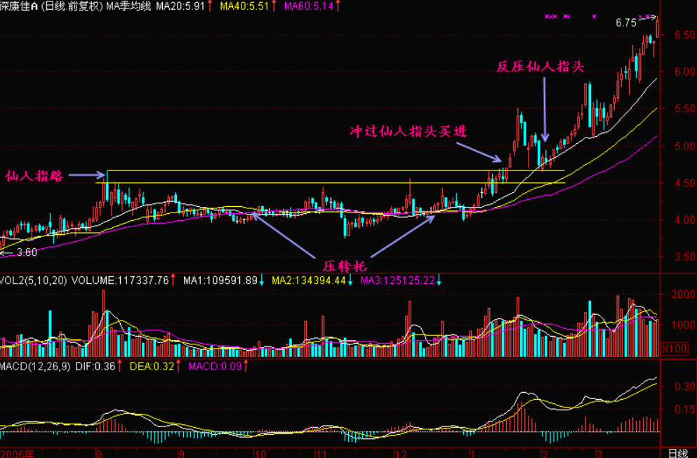 定义:股价长期下跌后庄家开始建仓介入,随着成交量的逐步放大,股价上穿均线系统,构筑价托、量托、出水芙蓉、多方炮等等底部形态,随着股价的进一步走高,继续收集筹码显得不经济,也不知道盘子里面是否有老庄或者大户混迹其中,遂在冲高到一定的价位后收出一根带长上影线的K线,该K线可阴可阳,之后股价回落整理,这根带长上影线的K线就称为“仙人指路”!