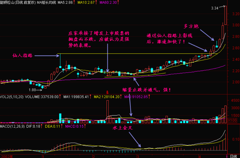 还有一种回档时间稍长的仙人指路。在小山头的仙人指路以后股价会有回落,此时会出现一组托压互变的图形,如果后面股价能冲过山头,那么就是黑马!