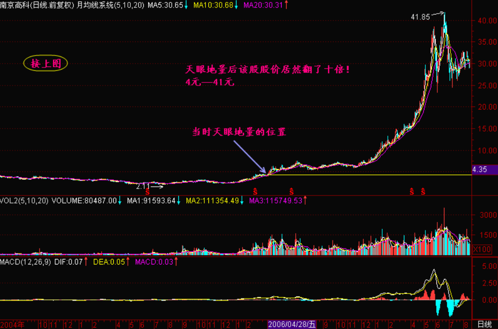 在股市中能有“天眼”至少能捕捉到大黑马。此时日K线的成交量相当萎缩,被称为“地量”。成交量极其萎缩,说明在指数下跌的过程中开“天眼”的个股下跌动量减弱。成交量越小,说明沽压越轻。“地量”是对“天量”而言,人们把极其巨大的成交量称为“天量”,那么极其微小的成交量就称为“地量”。此时的日K线经常带有下影线,这说明股价跌下去后,当天就能把价格拉上来,从而留下一根下影线。也可以说,下影线表明股价跌无可跌,而且当天就有收缩能力。收缩能力越强,说明指数好转后的上升动力也就越大。