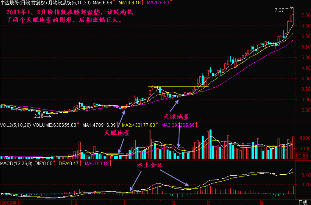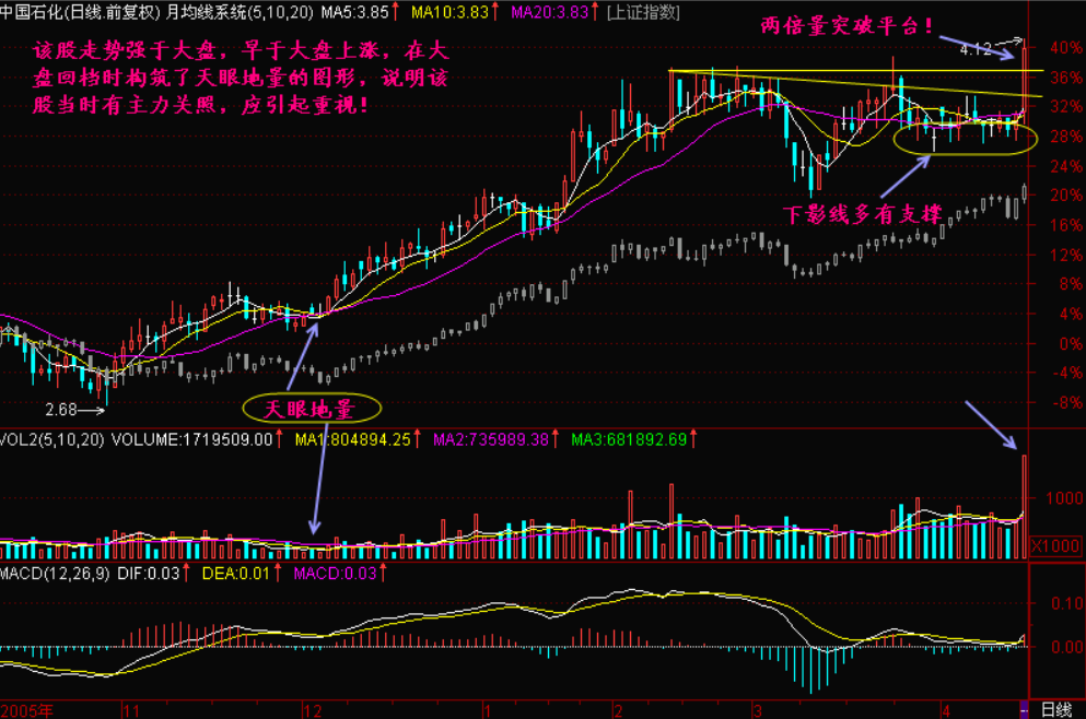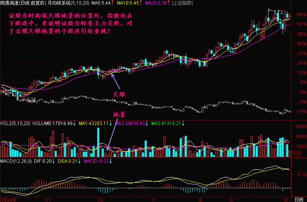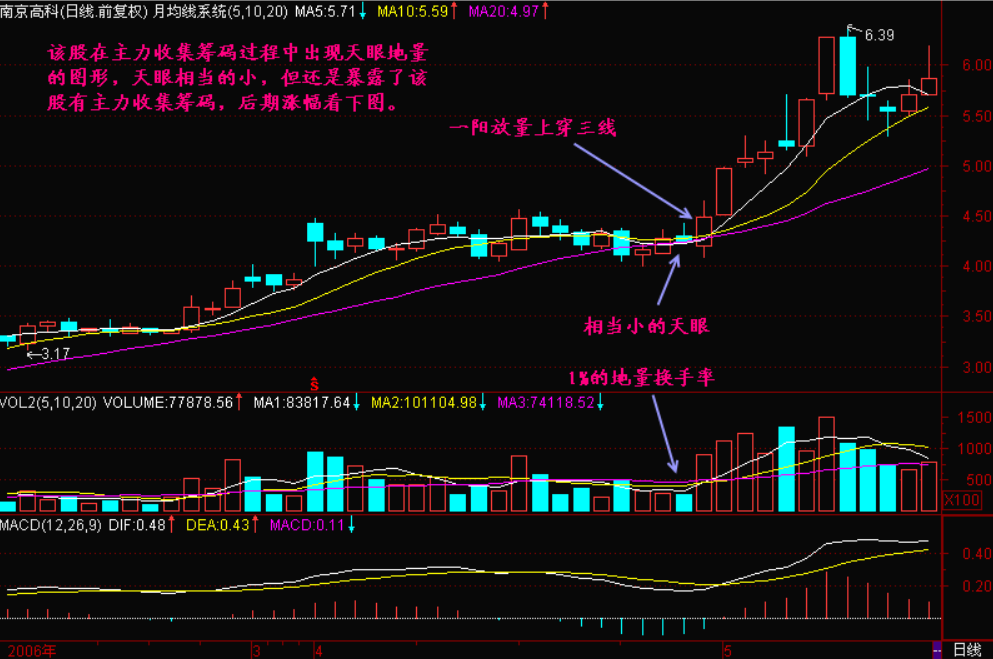 用5日、10日、20日平均线K线图,是因为5日代表一周交易日,10日代表两周交易日,20日代表一月交易日。这组均线簇被称为“月均线系统”。寻找那些5日均线轻微跌破20日均线,形成一个很小的“天眼”。这是一类很典型的图形,在K线图上留下5日均线和20日均线相交叉后的小“天眼”。对于上班族来说,这一类图形是再好辨认不过了。