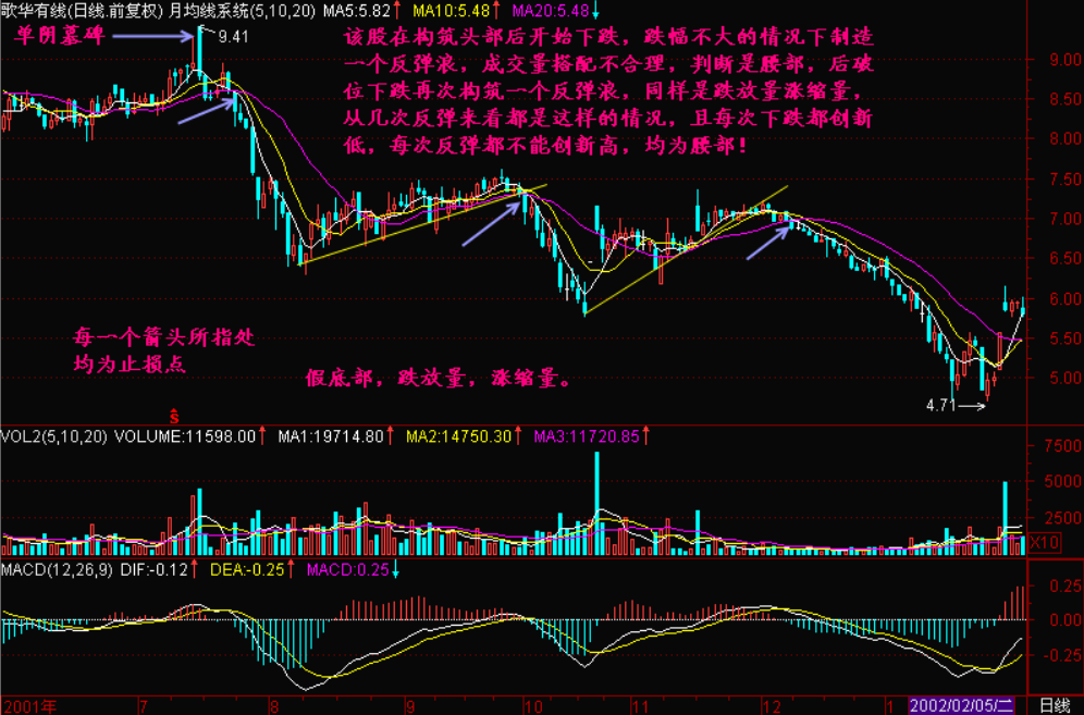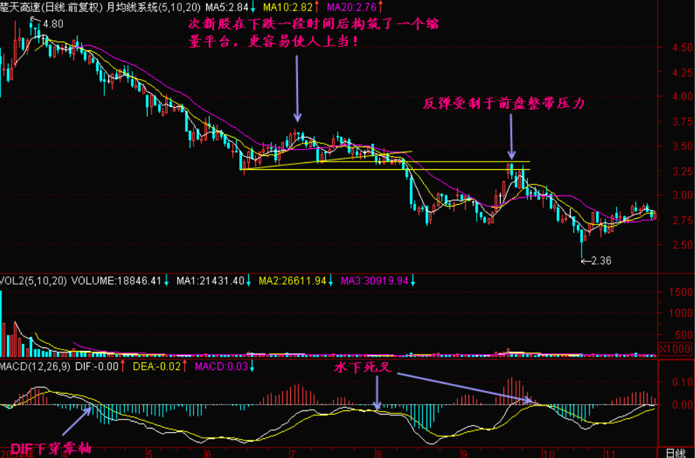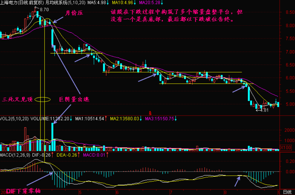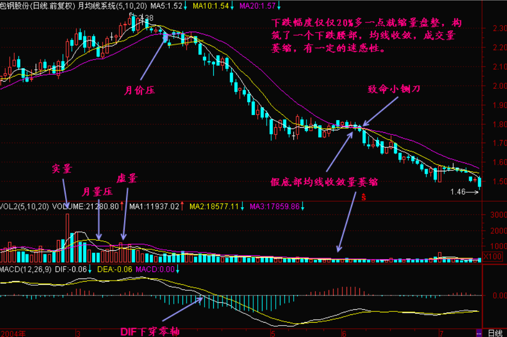 “一江春水向东流”的跌势还是容易识别和操作的。很多个股在下跌的过程中会出现无量盘整,其下跌速度减缓、成交量的萎缩以及均线系统的收敛都会使操作者误认为个股底部正在形成。