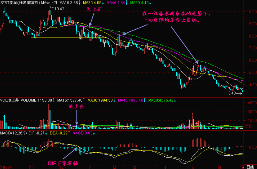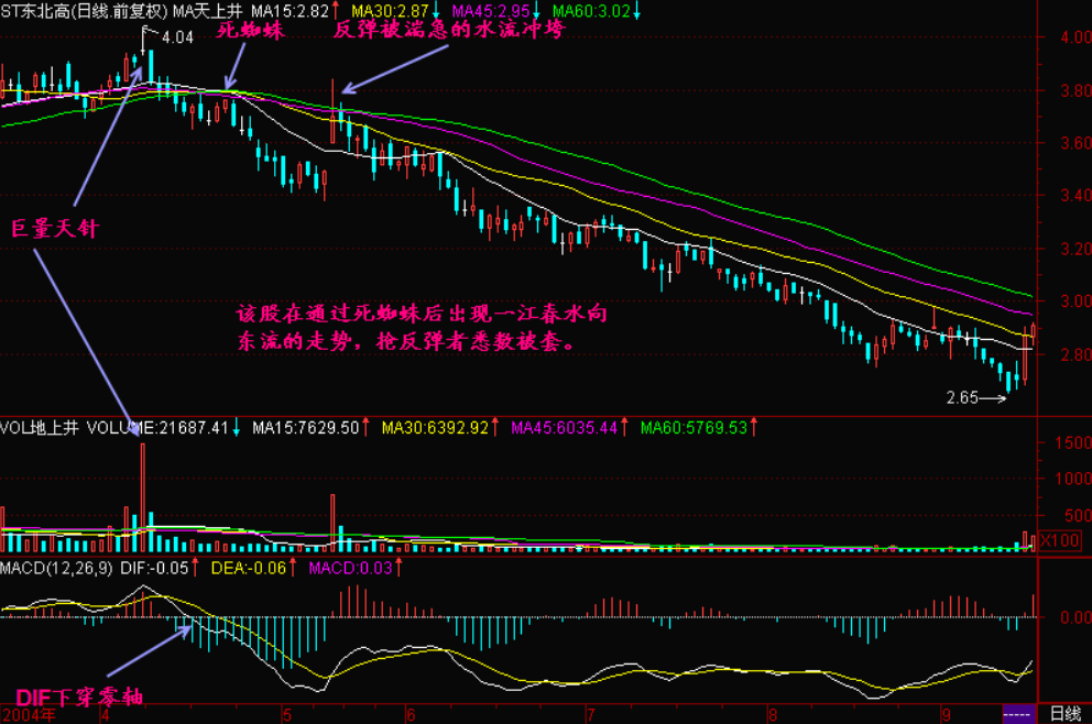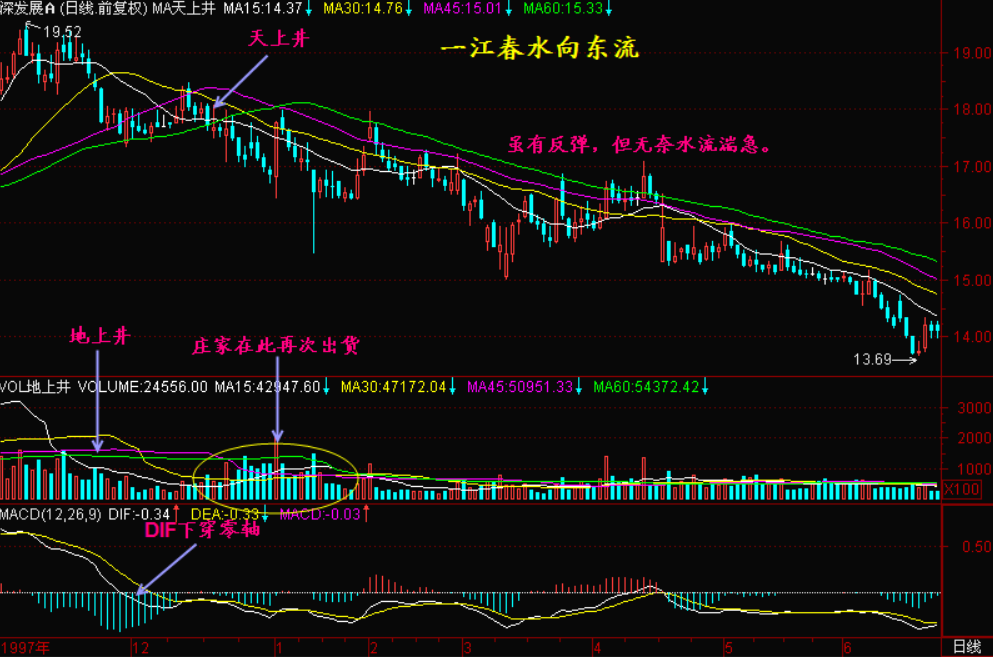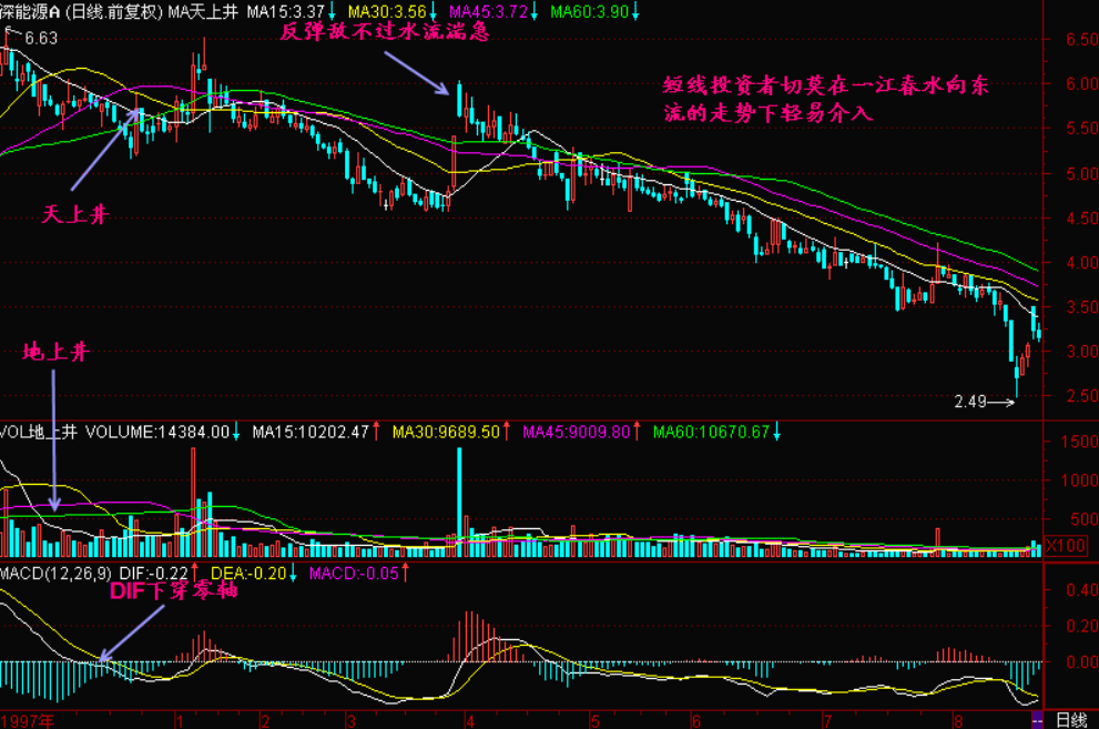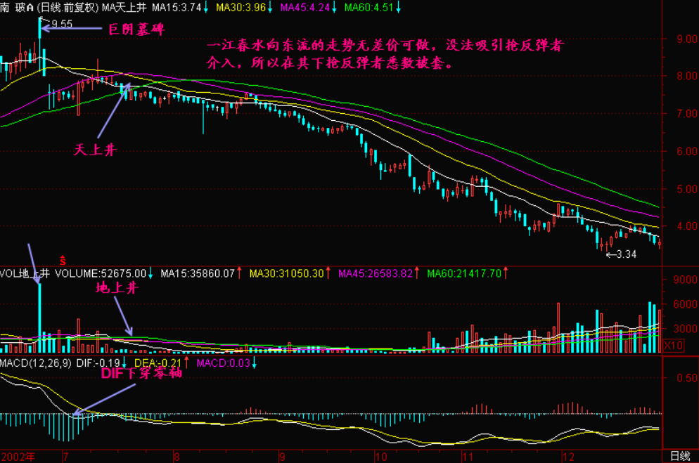 小结:一江春水向东流的走势说明均线、K线之间呈均速下跌,等距下跌,这样的下跌行情不容易获得抢反弹资金的青睐,所以导致股价一路下滑,直到加速下跌时才可能有人来抢反弹,而中线介入的机会要等待股价不创新低了,有资金进入导致创新高了,才可能有机会。