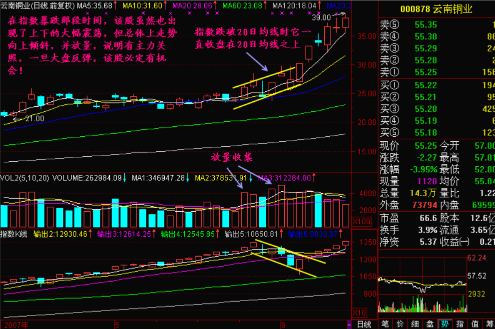 下面的这只个股有些特殊,在大盘下跌时他也跌破过均线,但就是比大盘强,因为他漏马脚了!