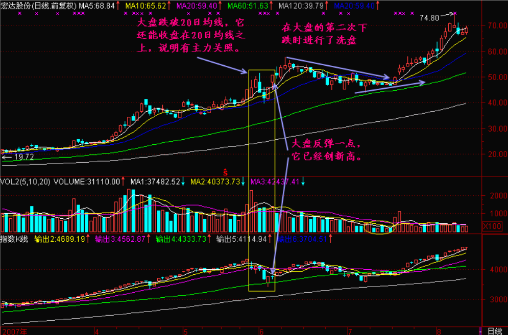 一般选强势股最简单的方法就是看指数已经跌破20日均线时,那些没跌破20日均线的个股,或者没跌破10日均线的个股,最好是不跌破5日均线的个股。这样的个股好像完全和暴跌没有关系,自顾自的走自己的行情,这样的个股起码说明以下几点。