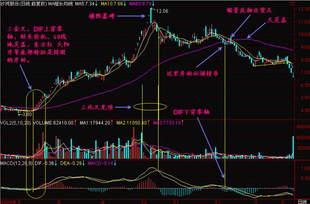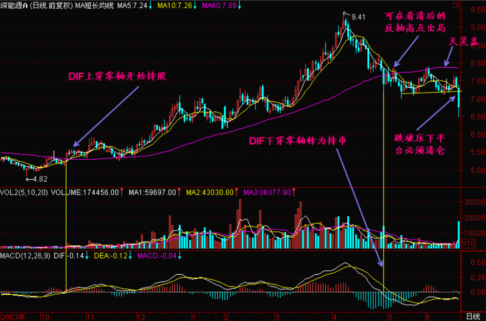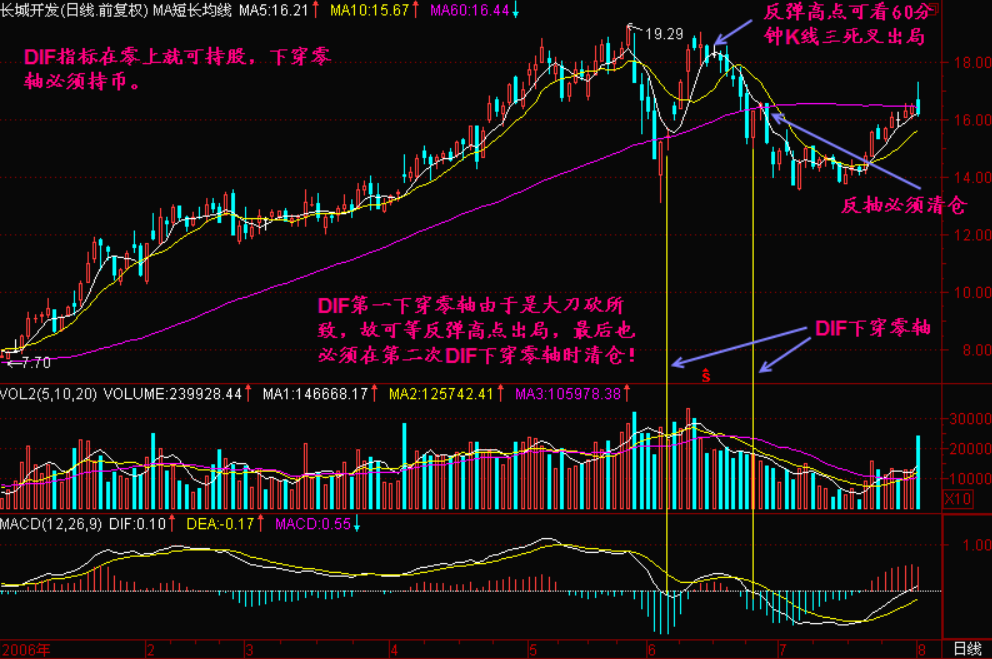 一般情况下,MACD的走势是根据价格平均线变化的,但有时也有领先或滞后现象。我们利用DIF下穿零线的特性,有时可提前预报下跌行情。