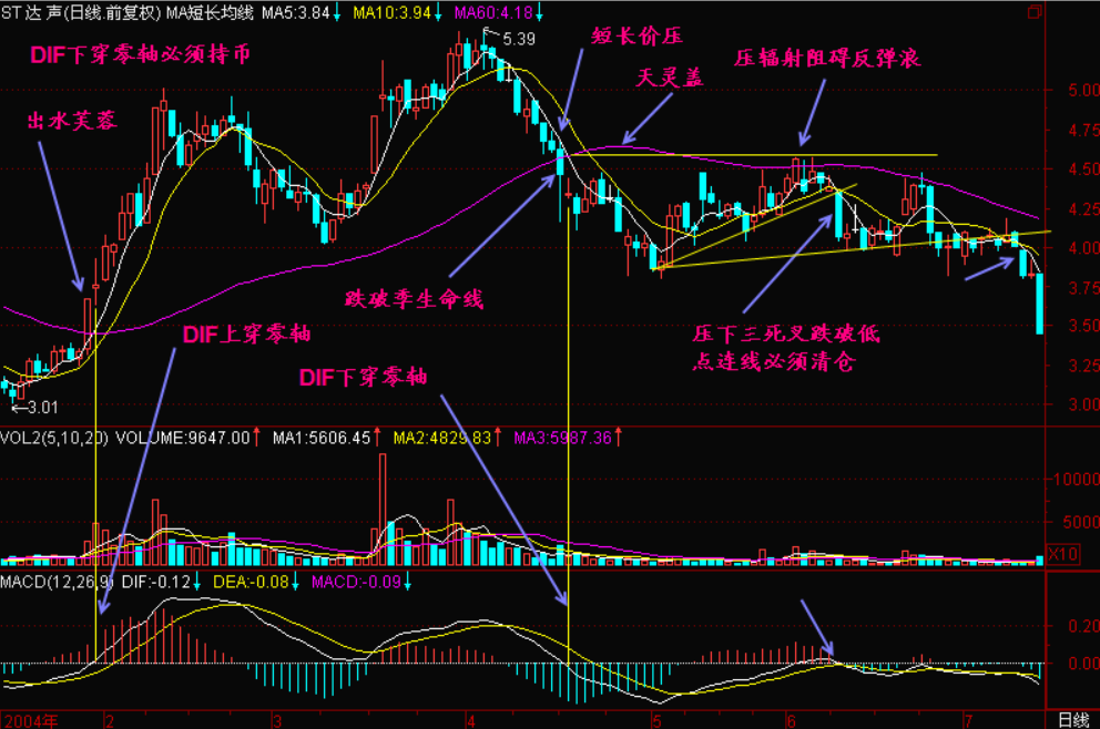 当股价难创新高或股价跌破季均线时,会出现DIF下穿零线,呈负数。