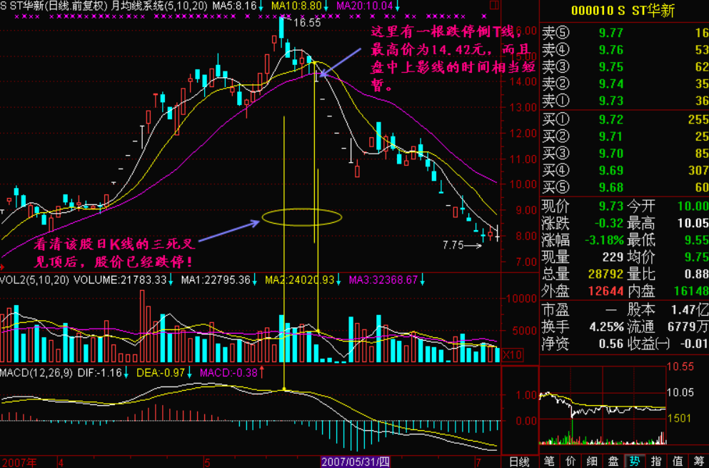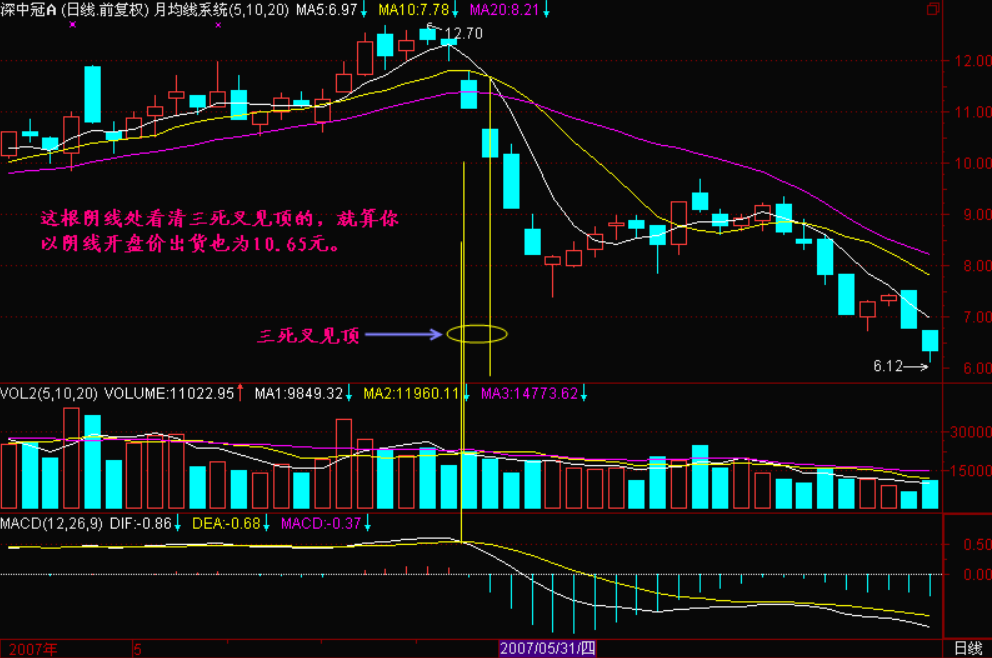 当日K线三死叉出现时是一轮调整开始的信号,如果出现在头部就是逃顶信号,即便出现在一个波段的相对高点,那也是一波回档开始的信号,对于短线操作者来说,见三死叉就应该出局回避下跌风险。