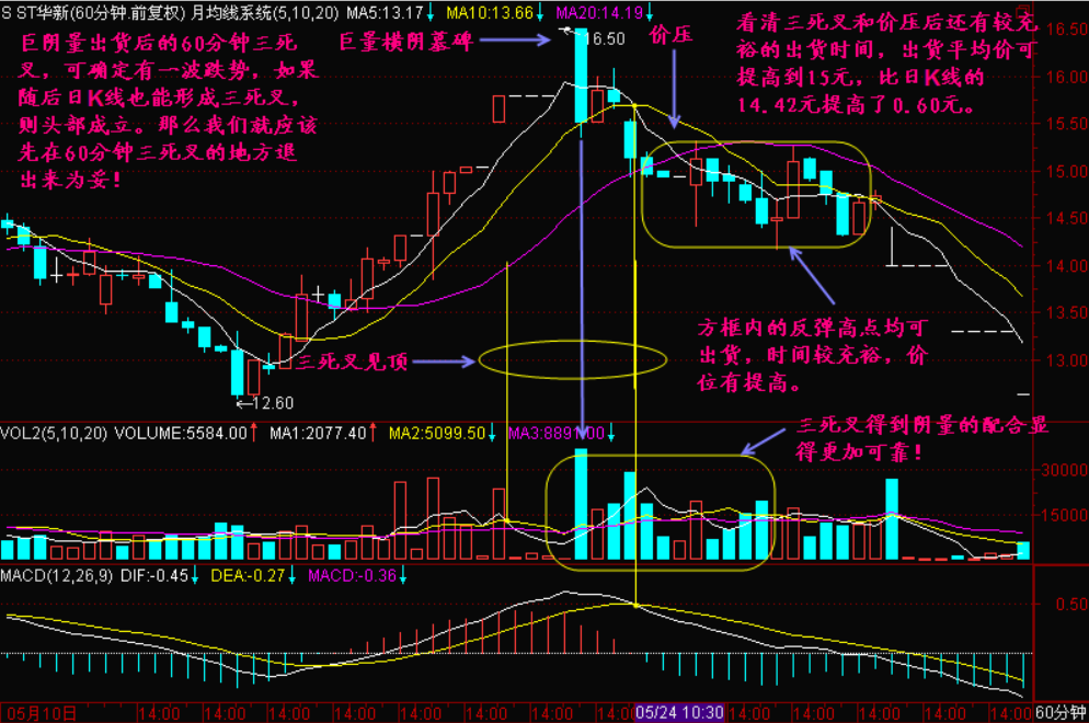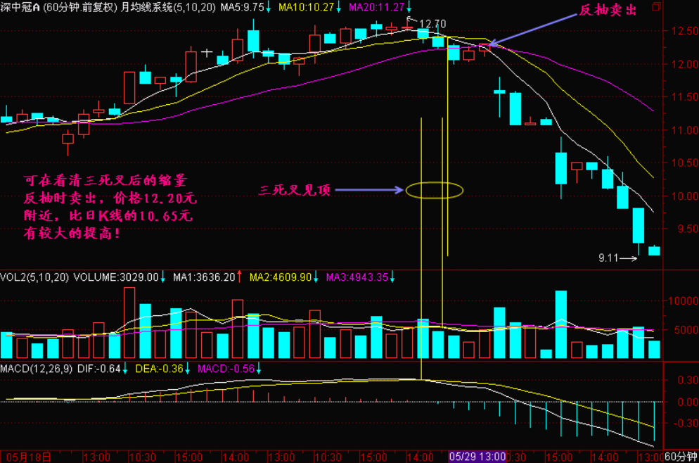 该股经过以上的四个周期一同分析,可得出60分钟K线图上那个三死叉出现后的缩量反抽高点应该坚决出货的结论,那么出货价格就比看清楚日K线图上三死叉时提高了不少!