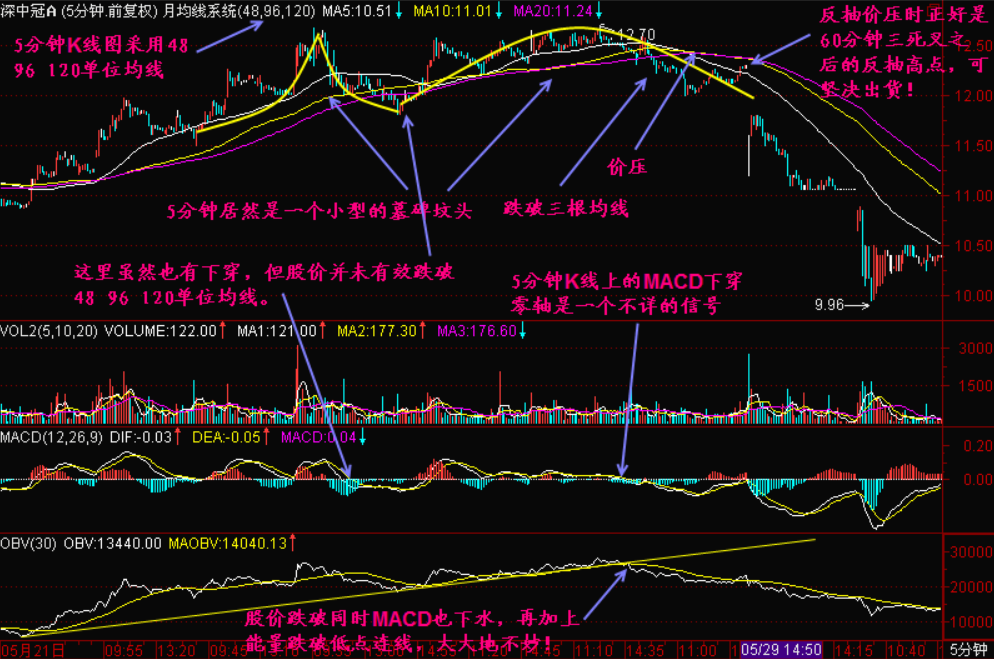 我们一般运用如60分钟三死叉见顶、30分钟三死叉见顶等短周期信号,在短期信号不能确定时,再辅以5分钟OBV能量潮等更精细的技术综合研判,可以帮助我们坚定卖出信心,从而达到提高出货价格的目的。