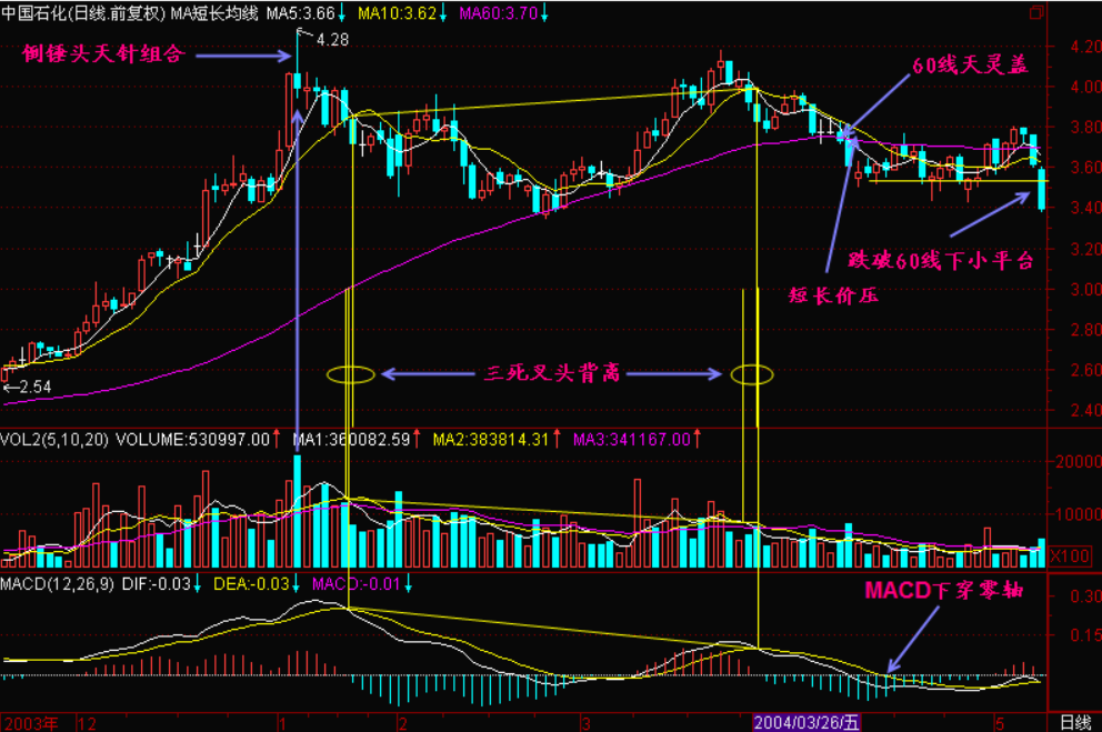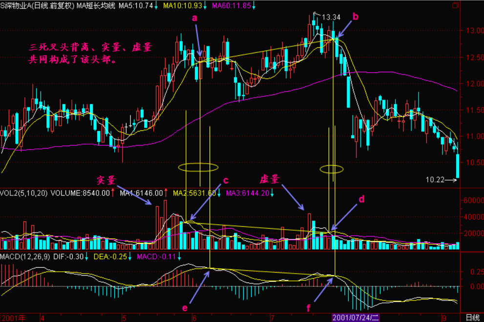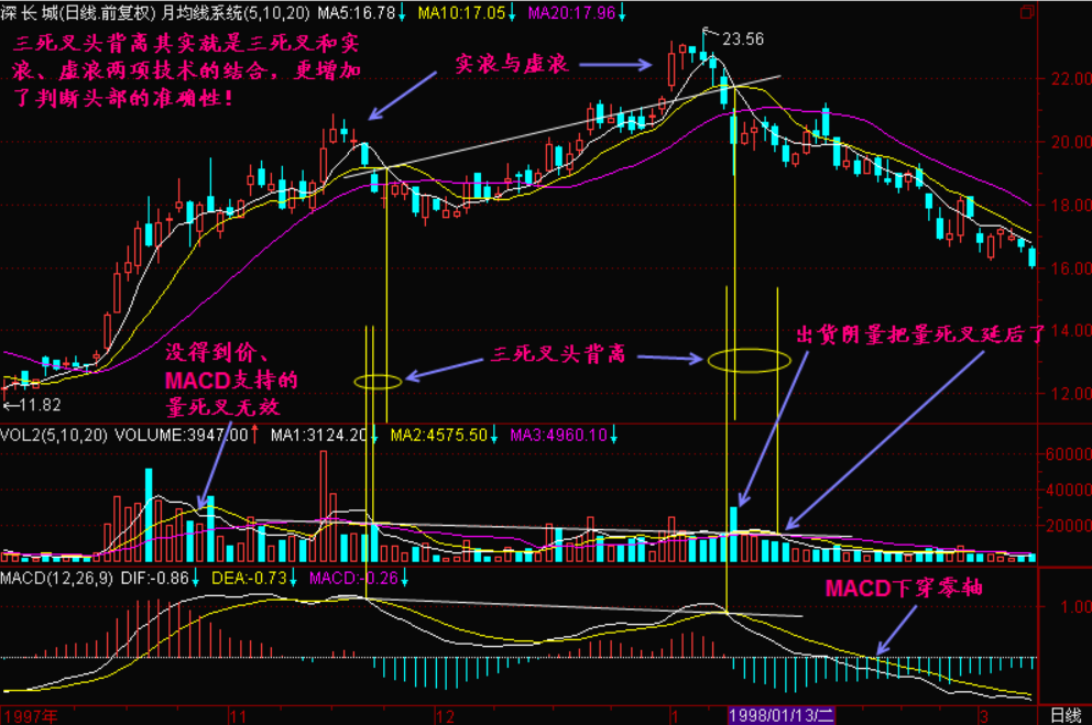 小结:三死叉头背离是可靠的判头技术,如果在股价长期上涨后庄家获利丰厚,那么此时出现三死叉头背离的走势意味着头部的成立,下跌是今后一段时间的主基调。